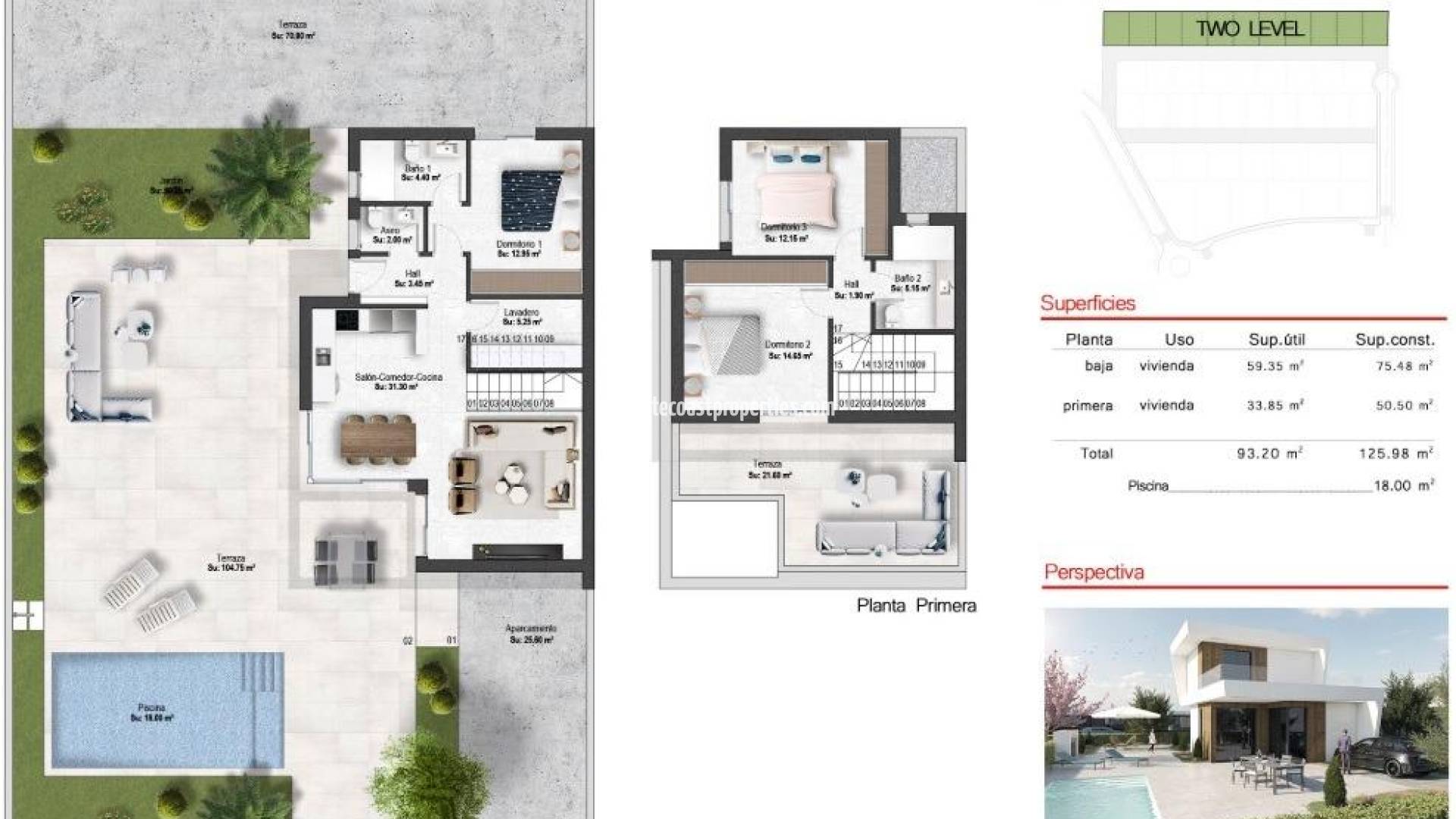 VILLAS DE OBRA NUEVA DE UNA SOLA PLANTA EN CAMPO DE GOLF ALTAONA, MURCIA Residencial de nueva construcción de hermosas villas en Altaona Golf resort, Murcia. Situado en un entorno privilegiado donde podemos vivir tranquilamente, en contacto con la naturaleza y la montaña, conseguimos calidad de vida, aire puro y espacios abiertos. Chalets de una sola planta construidos en parcelas desde 300 m2 con 3 dormitorios, 2 baños y piscina privada con múltiples opciones donde la calidad es nuestra máxima y donde integramos el exterior con el interior de la vivienda. Exclusivo residencial de Obra Nueva situado en Altaona Golf a tan solo 15 minutos en coche del centro de Murcia capital y a 20 minutos de las playas podrá disfrutar de la tranquilidad y seguridad que ofrece el Campo de Golf que cuenta con 18 hoyos y la comodidad de vivir cerca de todos los servicios. El aeropuerto de Murcias Corvera a solo 15 minutos en coche.