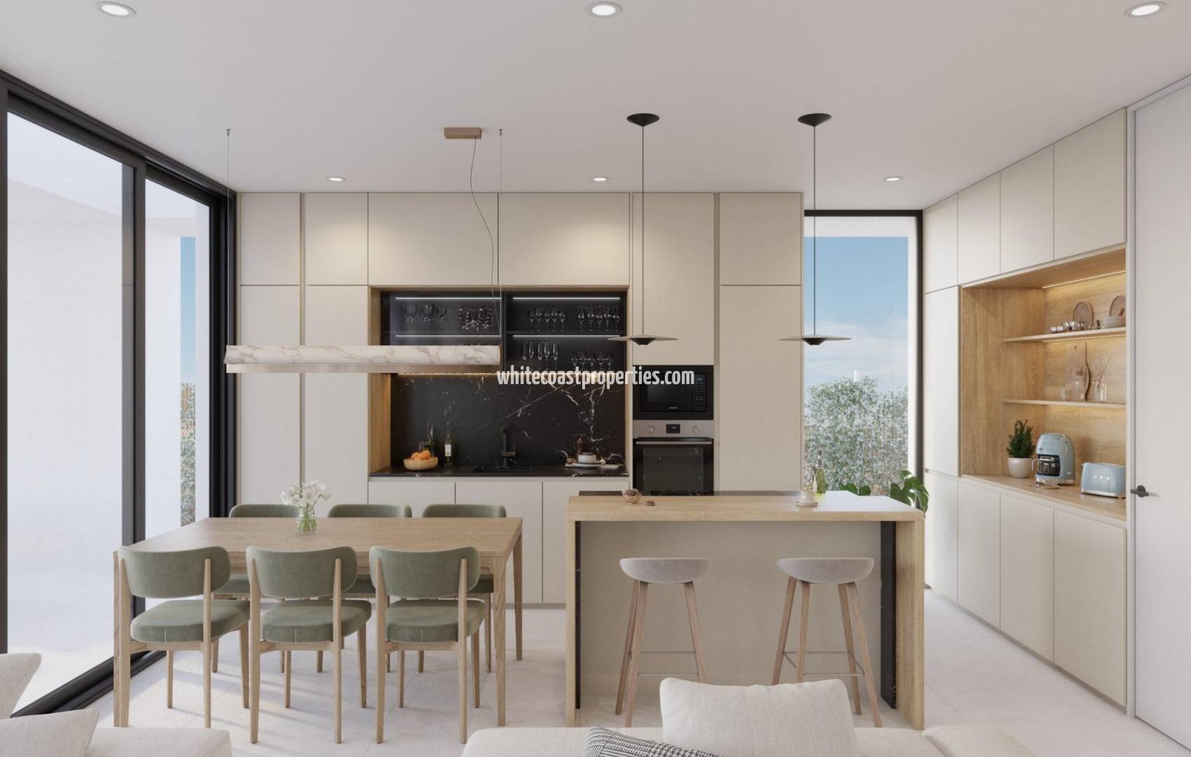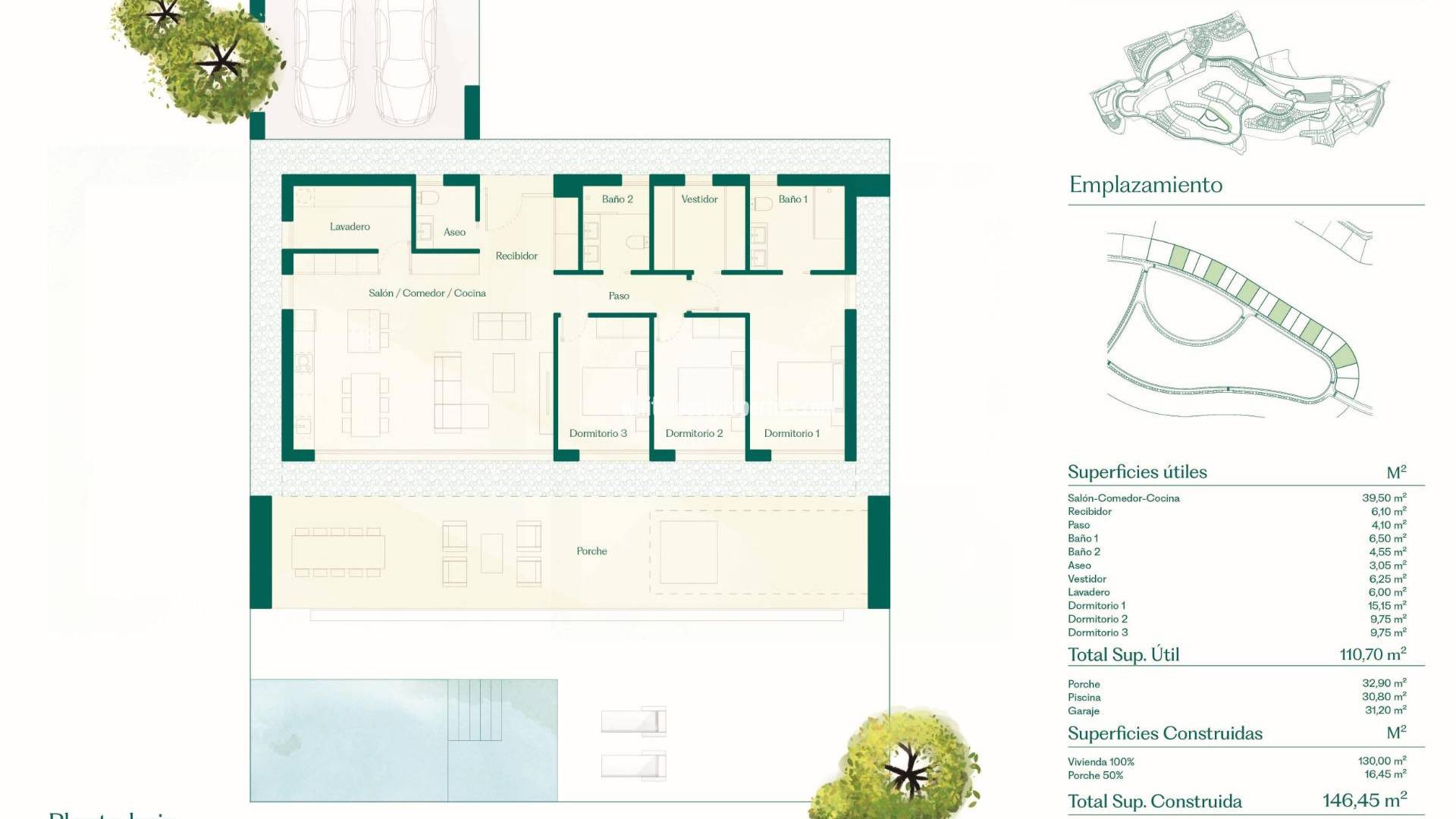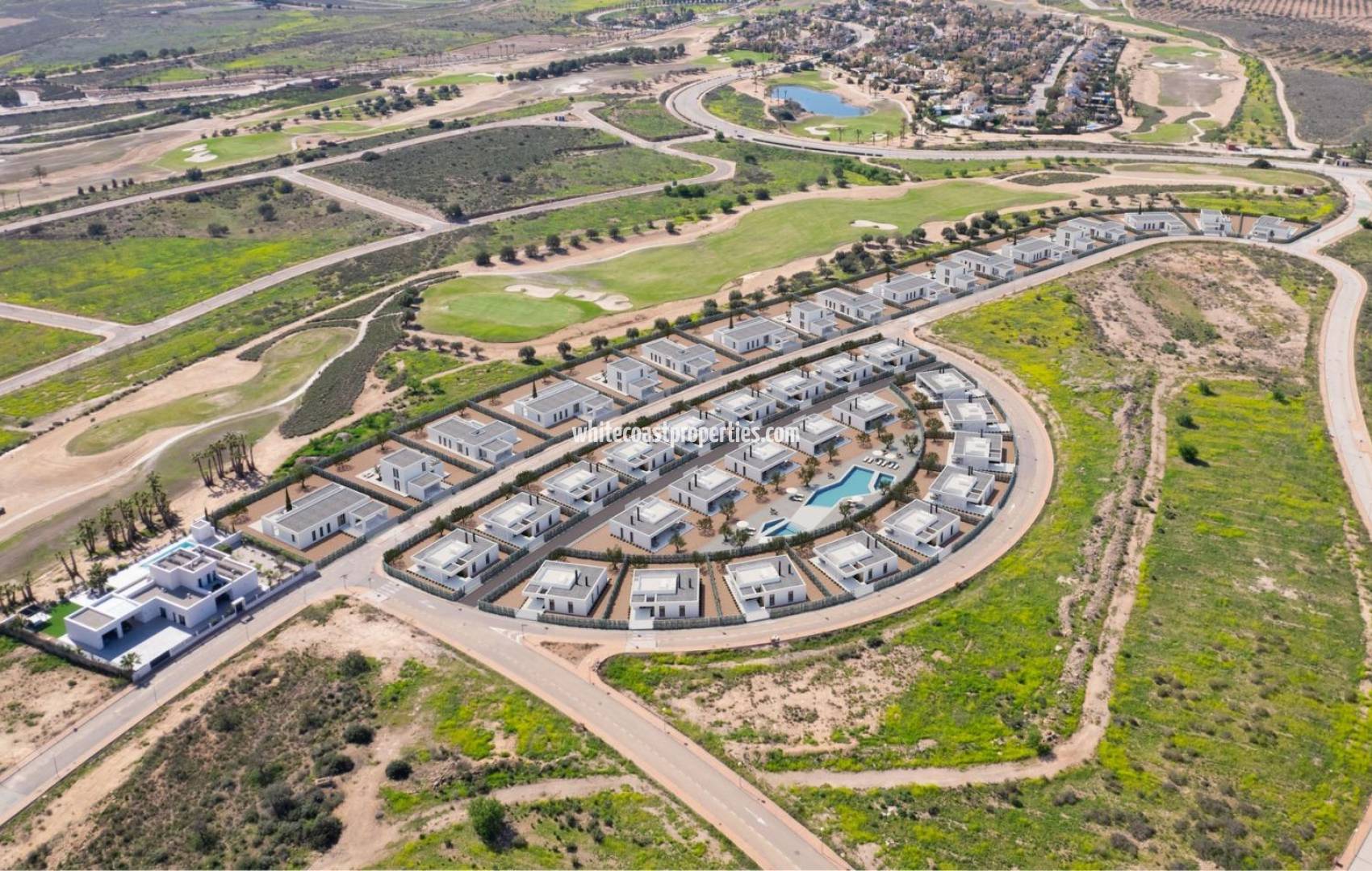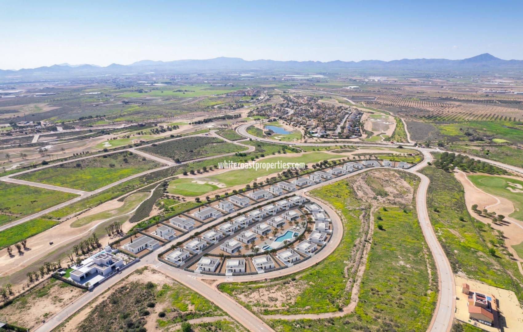 Exclusivas villas en primera línea de golf en Hacienda del Álamo, Costa Cálida Modernas villas en uno de los mejores complejos turísticos de golf de España Descubra una oportunidad única de adquirir una villa de lujo de nueva construcción en primera línea del complejo turístico Hacienda del Álamo Golf Resort, situado entre las históricas ciudades de Cartagena y Murcia, en el corazón de la Costa Cálida. Estas villas contemporáneas están diseñadas para ofrecer comodidad, privacidad y elegancia, y se encuentran en un entorno excepcional dedicado al golf y al ocio. Cada propiedad ofrece una distribución espaciosa con 3 dormitorios, 2 baños y un aseo de invitados, en un diseño de una o dos plantas, según el modelo elegido. Con generosas parcelas a partir de 700 metros cuadrados y una superficie construida de 146 metros cuadrados, estas viviendas ofrecen un amplio espacio para la vida interior y exterior. Características y acabados de alta calidad Estas villas en primera línea están equipadas con todas las comodidades modernas para garantizar el máximo confort y estilo, incluyendo: Piscina privada y jardín paisajístico con sistema de riego por goteo Cocina totalmente equipada con armarios y electrodomésticos incluidos Aire acondicionado por conductos en toda la propiedad Baños con muebles, espejos y mamparas de ducha Ventanas de aluminio con rotura de puente térmico y doble acristalamiento Acceso a una gran piscina comunitaria con césped natural y zona infantil Vida de lujo en Hacienda del Álamo Golf Resort Hacienda del Álamo es conocida por ser uno de los mejores complejos turísticos de golf de España, ya que ofrece a sus residentes un estilo de vida relajado, deportivo y cómodo. Campo de golf de 18 hoyos y academia Instalaciones deportivas que incluyen tenis, pádel, gimnasio y clases de fitness Casa club principal con vistas panorámicas, un restaurante de cocina mediterránea y terrazas soleadas Hotel y spa de 4 estrellas para el relax y el bienestar Espacios para toda la familia, con zonas de juegos infantiles, piscinas y carriles bici. Pueblo tradicional español con tiendas, cafeterías y nuevos restaurantes que abrirán próximamente. Ubicación estratégica con excelentes conexiones Aeropuerto de Corvera (Murcia): 18 km (aprox. 15 minutos) Cartagena: 36 km Centro de Murcia: 40 km Playas del Mar Menor: 28 km Centros comerciales (Dos Mares, Espacio Mediterráneo): a menos de 30 km La casa de sus sueños junto al golf le espera Tanto si busca una residencia permanente, un refugio para las vacaciones o una inversión inteligente en la Costa Cálida, estas villas en primera línea de golf en Hacienda del Álamo son la opción perfecta. Póngase en contacto con nosotros hoy mismo para obtener más información o concertar una visita personalizada.