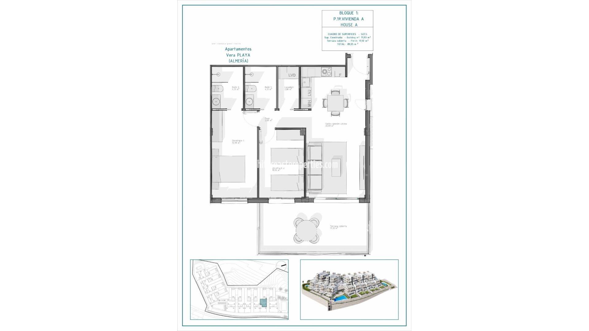 Apartamentos de nueva construcción en Vera Playa, Almería: viviendas modernas cerca del mar Vida contemporánea en Pueblo Salinas, a solo 2 km de la playa Presentamos una impresionante nueva promoción residencial situada en la codiciada zona de Vera Playa, dentro de la exclusiva urbanización Pueblo Salinas. Este moderno complejo ofrece un estilo de vida privilegiado a solo 2 km de las playas de Vera (Almería), con espectaculares vistas al mar y un tranquilo entorno mediterráneo ideal para vivir todo el año o disfrutar de las vacaciones. Viviendas elegantes con comodidad y estilo modernos Esta nueva promoción consta de 60 apartamentos de alta calidad distribuidos en 5 bloques de baja densidad, con solo dos viviendas por planta. Elija entre distribuciones de 2 o 3 dormitorios diseñadas pensando en la funcionalidad, el confort y el estilo. Las opciones incluyen: Plantas bajas con jardines privados Viviendas en plantas intermedias con amplias terrazas Áticos en la última planta con grandes soláriums que incluyen cocina de verano y pérgola con paneles solares. Todas las viviendas cuentan con: Cocinas abiertas totalmente equipadas con frigorífico integrado, lavavajillas, placa de inducción, horno, microondas y campana extractora Espacios diáfanos y luminosos con iluminación LED en toda la vivienda (excepto en los dormitorios) Persianas motorizadas de aluminio en los dormitorios Baños con acabados modernos, incluyendo calefactores para toallas, platos de ducha con mamparas de cristal y muebles empotrados Preinstalación de aire acondicionado por conductos Sistema aerotérmico para una producción eficiente de agua caliente Puerta de entrada de seguridad Excepcionales servicios comunitarios Los residentes disfrutarán de acceso a una amplia gama de servicios diseñados para mejorar el confort y el ocio, entre los que se incluyen: Dos piscinas al aire libre perfectas para los meses de verano Una piscina cubierta climatizada para uso durante todo el año Plaza de aparcamiento privada y trastero incluidos con cada propiedad Preinstalación para la recarga de vehículos eléctricos en las zonas de aparcamiento Ubicación privilegiada con excelentes conexiones Vera Playa es un popular destino costero conocido por sus amplias playas de arena y su estilo de vida relajado. La ubicación de la urbanización ofrece fácil acceso a los servicios y atracciones esenciales: Playa: 2 km Desert Springs Golf Resort: 8 km Centro de Vera: 5 km Puerto deportivo y restaurantes de Garrucha: 6 km Parque Comercial Mojácar: 10 km Aeropuerto de Almería: 85 km (1 hora en coche) Haga de Vera Playa su nuevo hogar Tanto si busca una residencia permanente, un refugio para las vacaciones o una inversión inteligente, estos apartamentos de nueva construcción ofrecen un valor inigualable en una de las zonas más deseadas de la Costa de Almería. Póngase en contacto con nosotros hoy mismo para obtener más información y programar su visita.