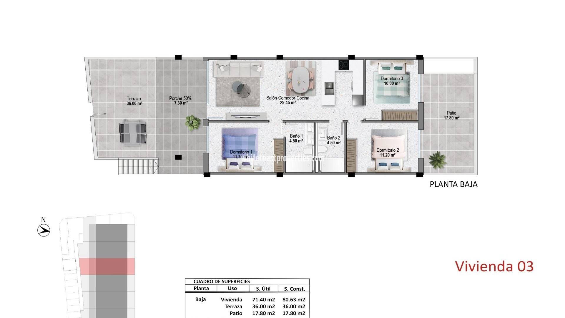 Bungalows de nueva construcción en Pilar de la Horadada, cerca de la playa y del centro de la ciudad Vida contemporánea en el corazón de la Costa Blanca Bienvenido a un complejo residencial boutique de 12 bungalows de nueva construcción situado en Pilar de la Horadada, una vibrante ciudad costera en el extremo sur de la Costa Blanca. Esta ubicación privilegiada ofrece la combinación perfecta de la tranquila vida mediterránea y la comodidad, con todos los servicios esenciales, tiendas, restaurantes y comodidades a poca distancia. Las hermosas playas de arena de Torre de la Horadada y Mil Palmeras están a solo 3 km, ideales para relajarse en la playa o practicar deportes acuáticos. Opción de bungalows en planta baja o en planta superior Este exclusivo complejo ofrece dos tipos de viviendas modernas que se adaptan a su estilo de vida: Bungalows en planta baja con 3 dormitorios, 2 baños y amplias terrazas privadas delantera y trasera con acceso directo a la piscina y los jardines comunitarios. Bungalows en la planta superior con 2 dormitorios, 2 baños y un amplio solárium privado en la azotea, con cocina de verano, pérgola y aseo de invitados. Todas las viviendas cuentan con luminosas zonas de estar de planta abierta, cocinas totalmente equipadas, aire acondicionado por conductos y aparcamiento privado. Los dormitorios incluyen armarios empotrados y los baños cuentan con calefacción por suelo radiante para mayor comodidad. Características premium para una vida mediterránea moderna Las viviendas están diseñadas con acabados de alta calidad y características prácticas, que incluyen: Puerta principal blindada con acabado de aluminio Persianas eléctricas en salón y dormitorios Sistema de agua caliente aerotérmica Electrodomésticos de cocina de BALAY o equivalente Soláriums en la azotea con césped artificial, ducha exterior, iluminación y cocina de verano completa con lavavajillas, nevera pequeña, placa de inducción y extractor. Ubicación estratégica con excelente conectividad Pilar de la Horadada está bien conectada con los principales puntos de interés de la Costa Blanca y la Costa Cálida: Playas (Torre de la Horadada / Mil Palmeras) - 3 km Campo de golf Lo Romero - 6 km Aeropuerto de Corvera (Murcia) - 40 km Aeropuerto de Alicante - 55 km Centro comercial Zenia Boulevard - 14 km Puerto deportivo de San Pedro del Pinatar: 11 km Su hogar ideal bajo el sol Tanto si busca una escapada de vacaciones, una residencia para todo el año o una inversión de alquiler, estos bungalows en Pilar de la Horadada ofrecen una excelente relación calidad-precio en una de las localidades más deseables de la Costa Blanca. Póngase en contacto con nosotros hoy mismo para concertar una visita o solicitar más información.