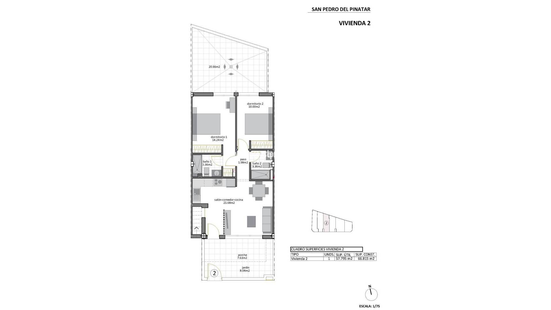 Bungalows de nueva construcción en San Pedro del Pinatar - Ubicación privilegiada a sólo 500 m de la playa Exclusivas viviendas de estilo boutique cerca de la costa Descubra estos elegantes bungalows de nueva construcción en el corazón de San Pedro del Pinatar, a sólo 500 metros de las impresionantes playas del Mar Menor. Esta promoción boutique incluye sólo ocho viviendas exclusivas, que combinan diseño moderno, confort y un tranquilo estilo de vida costero. Modelos disponibles para adaptarse a su estilo de vida Modelo Jardín/Planta Baja: Cuenta con una terraza delantera y un amplio patio trasero, perfecto para vivir al aire libre. Modelo Ático Loft: Incluye un solarium privado en la azotea y una terraza delantera, que ofrecen vistas abiertas y abundante luz solar. Detalles del modelo Garden/Planta Baja Entre en un luminoso salón que conecta a la perfección con el comedor y una cocina totalmente equipada. Las grandes puertas correderas de cristal dejan entrar la luz natural, creando un ambiente abierto y acogedor. La distribución incluye dos amplios dormitorios, el principal con baño en-suite y un moderno baño familiar. Aspectos destacados del modelo Ático Se accede al ático a través de una escalera privada que conduce a una gran terraza. En el interior, un salón y un comedor de planta abierta se combinan con una cocina totalmente equipada. Incluye dos dormitorios, el principal con baño en-suite. Un solarium privado en la azotea, accesible desde la cocina, ofrece un lugar ideal para relajarse o entretenerse. En la planta baja hay un trastero para mayor comodidad. Características principales Iluminación LED interior y exterior. Cocina totalmente equipada con placa de inducción, horno, lavavajillas y frigorífico/congelador. Aire acondicionado instalado. Plaza de aparcamiento. Jardín comunitario con piscina para residentes. San Pedro del Pinatar: Encanto costero y comodidad Situado en las hermosas costas del Mar Menor y el Mediterráneo, San Pedro del Pinatar es un paraíso para los deportes acuáticos, los entusiastas de la vela y los amantes de la playa. La cercana zona de Lo Pagán ofrece baños de barro natural, aguas tranquilas y servicios durante todo el año, como tiendas, restaurantes y locales de ocio. Distancias a los principales puntos de interés: Centro Comercial Dos Mares: 5 km Aeropuerto Murcia/Corvera: 30 km Aeropuerto de Alicante: 75 km Campos de golf locales: 10-20 km Puerto deportivo y clubes náuticos: 2 km Reserve hoy la casa de sus sueños Con la finalización prevista para finales de 2025, ahora es el momento perfecto para asegurar su nuevo hogar en San Pedro del Pinatar. No pierda esta oportunidad de disfrutar de una mezcla de elegancia moderna y tranquilidad costera. Póngase en contacto con nosotros hoy mismo para obtener más información o concertar una visita.