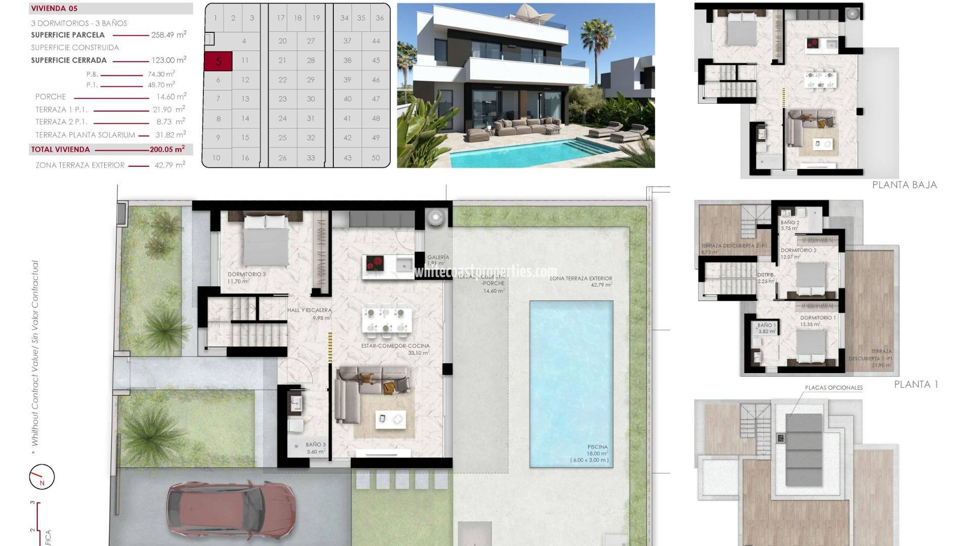 Exclusiva vida mediterránea en Lo Marabú, Ciudad Quesada Ubicación privilegiada con naturaleza y comodidad Descubra el encanto de vivir en Lo Marabú, Ciudad Quesada, una exclusiva zona residencial que combina el confort moderno con la belleza de la naturaleza mediterránea. Enclavada en una ubicación privilegiada, esta urbanización ofrece fácil acceso a los servicios esenciales a la vez que proporciona un entorno sereno y tranquilo. A poca distancia en coche, encontrará las impresionantes lagunas saladas de La Mata y Torrevieja, un paraíso para los entusiastas de la naturaleza, los fotógrafos y los que buscan bienestar. Hermosas playas y actividades al aire libre A sólo 15 minutos en coche, las playas vírgenes de Guardamar del Segura y Torrevieja invitan a disfrutar de dunas doradas y aguas cristalinas. Estas joyas costeras ofrecen oportunidades para relajarse, practicar deportes acuáticos y dar pintorescos paseos por la orilla. Para los entusiastas del aire libre, la zona cuenta con numerosas rutas de senderismo y ciclismo, mientras que los amantes del golf apreciarán la proximidad a varios campos de golf de prestigio, proporcionando una experiencia deportiva de primera clase. Viviendas y servicios de alta calidad Este complejo residencial cuenta con viviendas cuidadosamente diseñadas, entre las que se incluyen: Bungalows: Unidades de planta baja con jardín privado u opciones de planta alta con solárium. Todos los bungalows incluyen dos dormitorios, dos baños, una plaza de aparcamiento y un trastero, alrededor de una zona comunitaria central con piscina y jardines paisajísticos. Chalets: Viviendas independientes de tres dormitorios y tres baños, disponibles en una o dos plantas. Cada villa incluye piscina privada, solarium y aparcamiento dentro de la parcela. También hay sótanos opcionales. Confort moderno y características excepcionales Todas las viviendas están construidas con materiales y acabados de primera calidad: Ventanas de PVC con doble acristalamiento y persianas motorizadas con mando a distancia. Suelo radiante eléctrico en baños. Instalación de aire acondicionado por conductos. Chalets con piscinas privadas (3,00 x 6,00 m) y duchas de acero inoxidable. Piscinas comunitarias con zona infantil para los residentes de los bungalows. Como oferta especial de lanzamiento, algunas viviendas incluyen electrodomésticos y un paquete de muebles. Excelente conectividad y puntos de interés locales Estratégicamente situada en Rojales, Alicante, esta promoción ofrece excelentes infraestructuras y conectividad: Aeropuerto de Alicante-Elche (ALC): 38 km (35 minutos en coche). Aeropuerto Murcia-Corvera (RMU): 65 km (50 minutos en coche). La proximidad a las principales carreteras, como la AP-7 y la N-332, garantiza un fácil acceso a las ciudades y lugares de interés cercanos. Los centros comerciales locales, restaurantes y servicios diarios están a poca distancia. Disfrute de la vida mediterránea Con su mezcla perfecta de vida moderna, belleza natural y comodidad sin igual, este complejo residencial en Lo Marabú es la opción ideal para aquellos que buscan un estilo de vida de alta calidad. No pierda la oportunidad de invertir en la casa de sus sueños en el corazón del Mediterráneo. Póngase en contacto con nosotros hoy mismo para concertar una visita o para obtener más información sobre esta excepcional promoción.