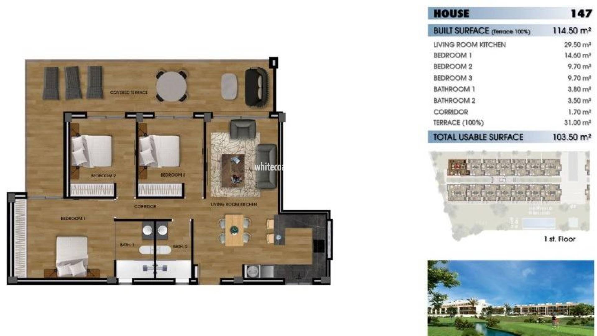 NUEVO COMPLEJO RESIDENCIAL CERCA DE LA SERENA GOLF, LOS ALCAZARES Este increíble complejo de obra nueva estará formado por 244 apartamentos de 2 y 3 dormitorios, divididos en 8 bloques y 20 Villas privadas. Apartamentos modernos en 3 plantas (planta baja más 2), planta baja con bonitos jardines, y algunos de ellos con piscina privada y segunda planta con bonitas terrazas y solariums privados. Apartamentos en esquina (4 por planta) y los de planta alta tienen 3 dormitorios y el resto 2 dormitorios. Viviendas orientadas al Este con vistas a las zonas comunes y al Oeste con maravillosas vistas al campo de golf. Complejo con piscina comunitaria y zonas comunes. Cada apartamento tiene su propia plaza de aparcamiento y trastero privado en el sótano, incluido en el precio. Residencial situado en primera línea del prestigioso campo de golf "La Serena Golf". Este campo de golf es muy conocido por sus lagos y vegetación que se entrelazan con el campo de golf. El agua y los lagos están presentes en 16 de los 18 hoyos, pero todo el recorrido está diseñado para ofrecer al golfista diferentes estrategias en cada hoyo. Otro aspecto que hace único a este campo de golf es que está conectado a pie con el centro de la ciudad, algo imposible de encontrar en otros lugares de golf que nos permiten disfrutar de la tranquilidad y la belleza de la zona sin renunciar al acceso a los servicios que ofrece Los Alcázares. Los Alcázares una zona excepcional en la Costa Cálida a tan sólo 25 minutos del aeropuerto de Murcia y 55 min del aeropuerto de Alicante. La zona está conectada a través de autovía con las ciudades de Cartagena, Murcia y Alicante y el resto de playas de la Costa Cálida y la Costa Blanca.