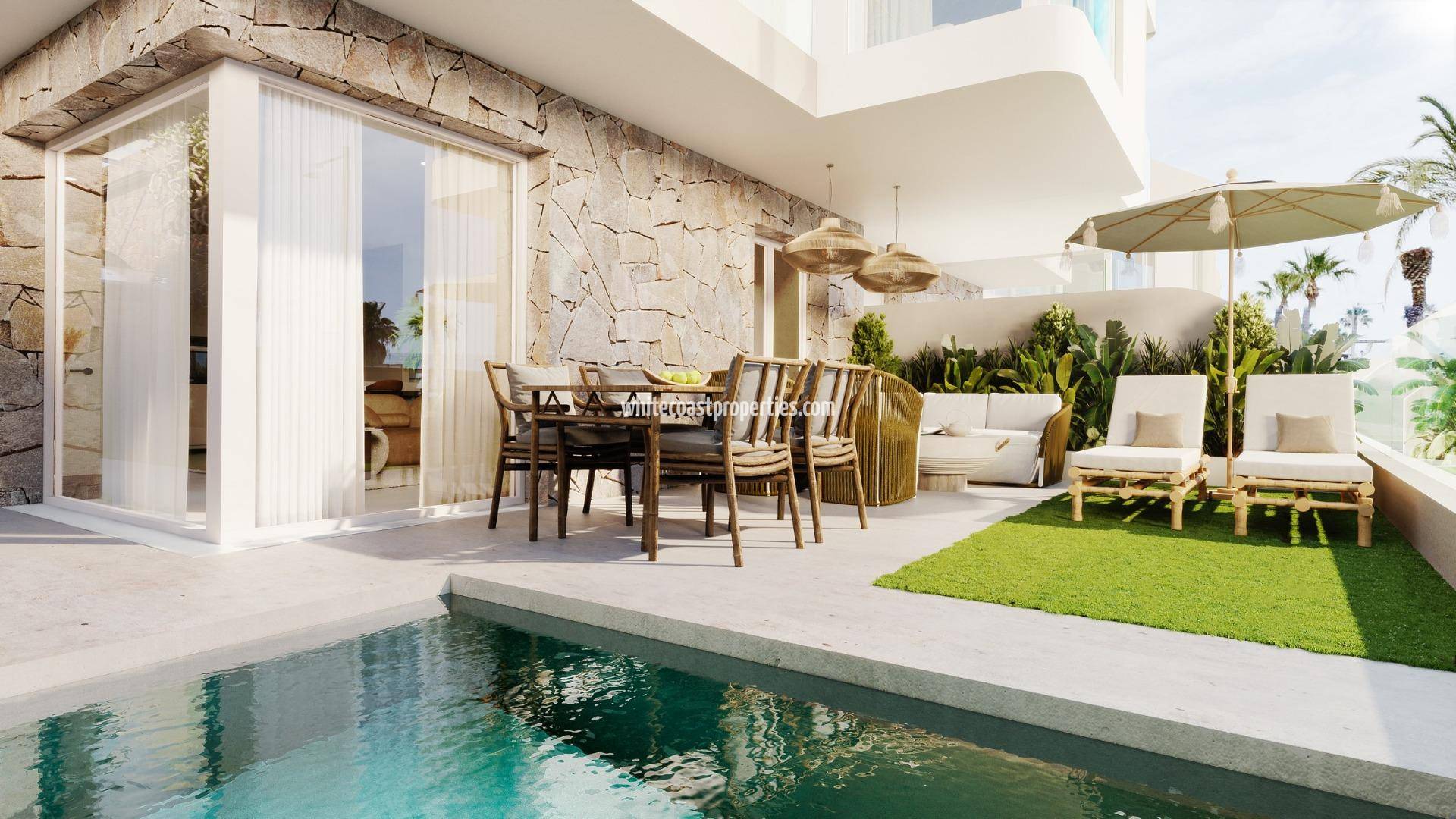 Exclusivas viviendas de nueva construcción frente al mar en venta en Mojácar, Costa de Almería Vida boutique frente al mar en una de las zonas más deseadas de Mojácar Descubra una excepcional urbanización boutique compuesta por solo 10 viviendas exclusivas situadas en primera línea de playa en la zona de La Mena, en Mojácar. Esta ubicación privilegiada ofrece acceso directo a través del Paseo del Mediterráneo a las doradas arenas y las cristalinas aguas del mar Mediterráneo. Rodeada de clubes de playa, restaurantes y un tranquilo ambiente costero, esta zona es ideal para aquellos que buscan un estilo de vida refinado junto al mar. Mojácar Playa y el Parador de Mojácar están a solo 3 km, lo que ofrece una amplia gama de servicios, entretenimiento y belleza natural. Viviendas elegantes diseñadas para el confort y las vistas al mar Esta exclusiva promoción ofrece propiedades de tres dormitorios y tres baños disponibles en dos configuraciones. Los compradores pueden elegir entre cuatro adosados con solárium privado y jacuzzi opcional, o seis villas pareadas, cada una con su propia piscina privada. Todas las viviendas incluyen un amplio garaje subterráneo para dos coches y un aseo, amplias terrazas y generosas zonas ajardinadas que maximizan el disfrute del aire libre y las vistas al mar. Especificaciones de alta calidad y opciones de personalización Cada propiedad está equipada con un sistema de aire acondicionado aerotérmico totalmente instalado, lo que garantiza la máxima eficiencia energética y comodidad durante todo el año. Las cocinas no están amuebladas, lo que permite a los propietarios personalizar su diseño, con un proyecto de decoración completo incluido. Otras características adicionales son la preinstalación para tecnología domótica, puerta de entrada reforzada y materiales de construcción de alta calidad que mejoran la seguridad, el diseño y la durabilidad. Ubicación privilegiada con excelente conectividad Situada en un tranquilo entorno frente al mar, la urbanización goza de un cómodo acceso a los principales destinos de la Costa de Almería. Mojácar Pueblo, con sus pintorescas calles encaladas, se encuentra a poca distancia en coche. Entre los puntos de interés más populares se incluyen: Mojácar Playa 3 km Parador de Mojácar 3 km Marina de Garrucha 12 km Campo de golf Marina Golf a 6 km Aeropuerto de Almería a 80 km Aeropuerto de Murcia Corvera a 150 km Asegúrese su vivienda en primera línea de playa en Mojácar Disfrute de un estilo de vida en el que el mar forma parte de su rutina diaria y el lujo se combina con la serenidad de la costa. Tanto si busca un refugio para sus vacaciones, una residencia permanente o una inversión exclusiva, este complejo boutique frente al mar ofrece un valor inigualable. Póngase en contacto con nosotros hoy mismo para recibir más información o concertar una visita.