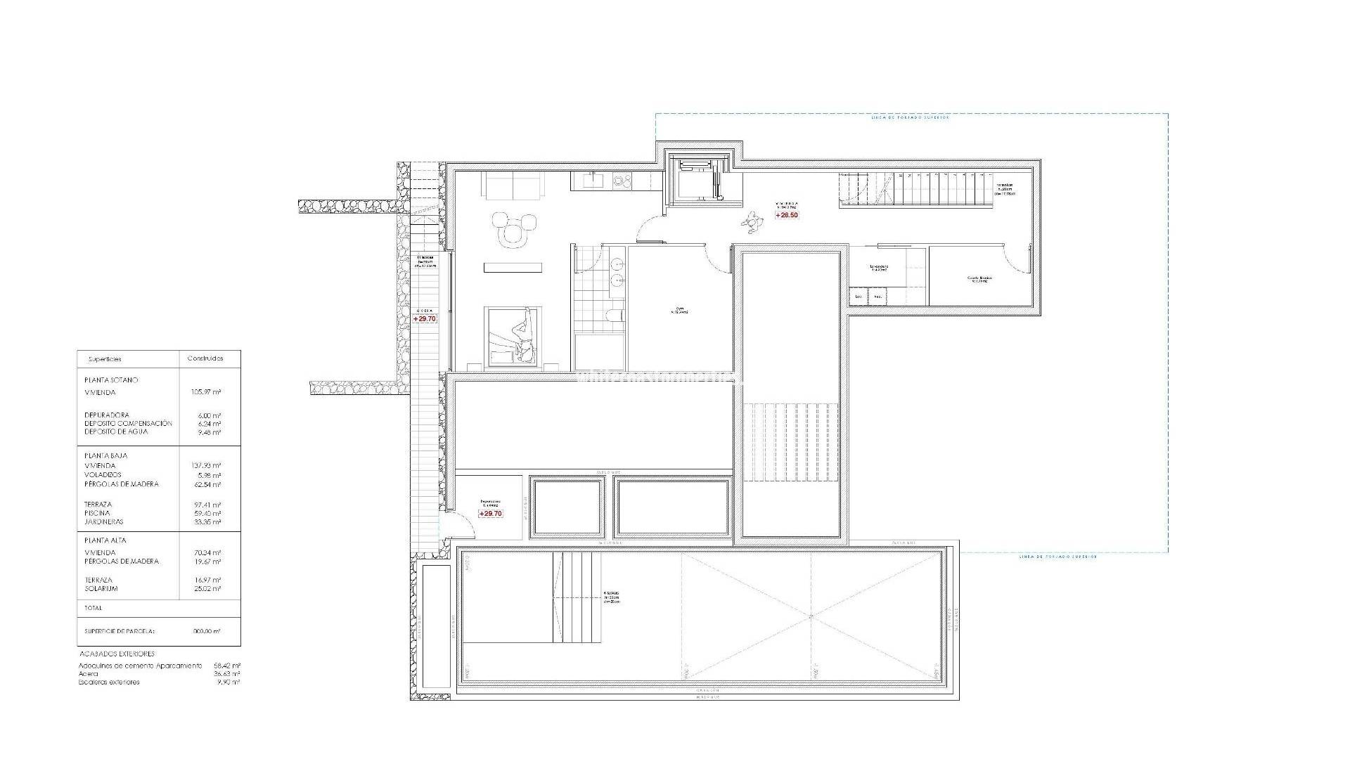 Villa contemporánea con vistas panorámicas al mar en La Fustera, Benissa Costa Esta exclusiva villa de nueva construcción, diseñada por un arquitecto de renombre y desarrollada por un promotor local con más de 20 años de experiencia, se encuentra en una parcela de 800 m² a pocos pasos de la playa de La Fustera. La arquitectura, que combina la calidez mediterránea con la elegancia contemporánea, integra piedra natural, madera y tonos neutros suaves, integrándose a la perfección en el paisaje costero. Con una superficie total construida de 716 m² distribuidos en tres niveles (sótano, planta baja y primera planta), la villa ofrece un equilibrio perfecto entre funcionalidad, diseño y comodidad. Planta sótano La planta baja, de 105,97 m², está diseñada para ser práctica y lúdica. Incluye un gimnasio totalmente equipado, un lavadero y zonas técnicas, con la opción de adaptar espacios adicionales como bodega, cine o sala polivalente. En esta planta también se encuentran el sistema de filtración de la piscina y los depósitos de agua, lo que garantiza una gestión eficiente de todas las instalaciones técnicas. Planta baja La planta principal, de 137,93 m², se desarrolla en una luminosa distribución diáfana que captura la esencia de la vida mediterránea. El espacioso salón, el comedor y la cocina se abren a través de grandes ventanales que van del suelo al techo a la terraza principal y a la piscina infinita, enmarcando las increíbles vistas panorámicas al mar que definen el carácter de esta vivienda. Dos dormitorios dobles, un cuarto de baño completo y un aseo completan esta planta, proporcionando comodidad y funcionalidad. En el exterior, una pérgola de madera da sombra a las zonas de salón y comedor al aire libre, rodeadas de exuberantes jardines, terrazas y una piscina infinita de 59,40 m² que se funde visualmente con el mar. Primera planta La planta superior, con 70,19 m², está reservada para la suite principal, un refugio privado con vestidor, baño en suite y una gran terraza privada con impresionantes vistas al mar Mediterráneo. Un segundo dormitorio o espacio de oficina completa esta planta, que también da acceso a un solárium de 25,02 m², ideal para relajarse bajo el sol y disfrutar de la serenidad del entorno. Exterior y ubicación Situada en una tranquila calle residencial rodeada de modernas villas, esta propiedad goza de una ubicación excepcional a solo 3 minutos a pie de la playa de La Fustera (150 m), el Mandala Beach Bar & Restaurant y servicios esenciales como supermercados y servicios locales. Diseñada con énfasis en la luz, el espacio y la vida interior-exterior sin fisuras, esta villa encarna el estilo de vida mediterráneo moderno: elegante, relajado y en perfecta armonía con sus espectaculares vistas panorámicas al mar. Asegúrese la villa de sus sueños en La Fustera, Benissa Costa, y disfrute del mejor estilo de vida mediterráneo con impresionantes vistas al mar y un confort inigualable.