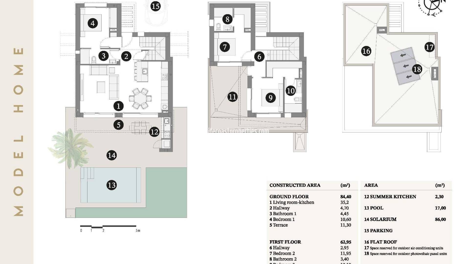 Modernas villas de nueva construcción cerca de la playa en Santiago de la Ribera Vida costera contemporánea en la Costa Cálida Descubra una exclusiva promoción de villas independientes en Santiago de la Ribera, situada a solo 750 m de las hermosas costas del Mar Menor. Esta encantadora localidad costera de la región de Murcia es conocida por su relajado estilo de vida mediterráneo, sus limpias playas de arena y su sol durante todo el año. Aquí podrá disfrutar de la combinación perfecta de privacidad, comodidad y proximidad a todos los servicios esenciales, opciones de ocio y actividades al aire libre. Ya sea como residencia permanente, casa de vacaciones o inversión con un gran potencial de alquiler, estas villas ofrecen una magnífica oportunidad para disfrutar de la vida costera en una de las zonas más deseadas de la Costa Cálida. Diseño elegante y distribución funcional Diseñadas con un estilo arquitectónico moderno y una gran funcionalidad, cada villa se distribuye en dos plantas para maximizar el espacio y la luz natural. Las viviendas incluyen 3 amplios dormitorios, uno de ellos en la planta baja 3 baños completamente equipados, todos en suite Jardín privado y piscina Terraza en la primera planta ideal para tomar el sol y relajarse Aparcamiento privado con puerta motorizada Esta inteligente distribución garantiza la comodidad y la privacidad, al tiempo que ofrece amplios espacios al aire libre para el entretenimiento, las comidas o simplemente para disfrutar del clima mediterráneo. Acabados de alta calidad y características premium Estas propiedades han sido construidas con altos estándares, con acabados de primera calidad e instalaciones modernas, que incluyen Puerta de entrada de seguridad reforzada Persianas motorizadas Cocina totalmente amueblada con electrodomésticos incluidos Baños con muebles, espejos y calefacción por suelo radiante Preinstalación para aire acondicionado por conductos Piscina privada Dos paneles solares fotovoltaicos con microinversor Diseñadas para su uso durante todo el año, estas viviendas garantizan eficiencia, comodidad y estilo en cada rincón. Excelente ubicación cerca del mar y de los servicios Situada en una tranquila zona residencial, pero rodeada de servicios, esta urbanización ofrece una comodidad inmejorable con rápido acceso a playas, puertos deportivos, tiendas y campos de golf. Las distancias incluyen Playas del Mar Menor 0,75 km Centro comercial La Ribera 2 km Roda Golf 5 km Puerto deportivo de Lo Pagán 4 km Centro comercial Dos Mares 3 km Aeropuerto de San Javier a 6 km Murcia a 40 km Cartagena a 30 km La zona es perfecta para los amantes de la naturaleza, los entusiastas de los deportes acuáticos y cualquiera que busque un estilo de vida vibrante pero tranquilo junto al mar. Haga realidad su sueño mediterráneo No pierda la oportunidad de adquirir una elegante villa de nueva construcción en una de las localidades costeras más codiciadas de Murcia. Póngase en contacto con nosotros hoy mismo para obtener más información o concertar una visita.