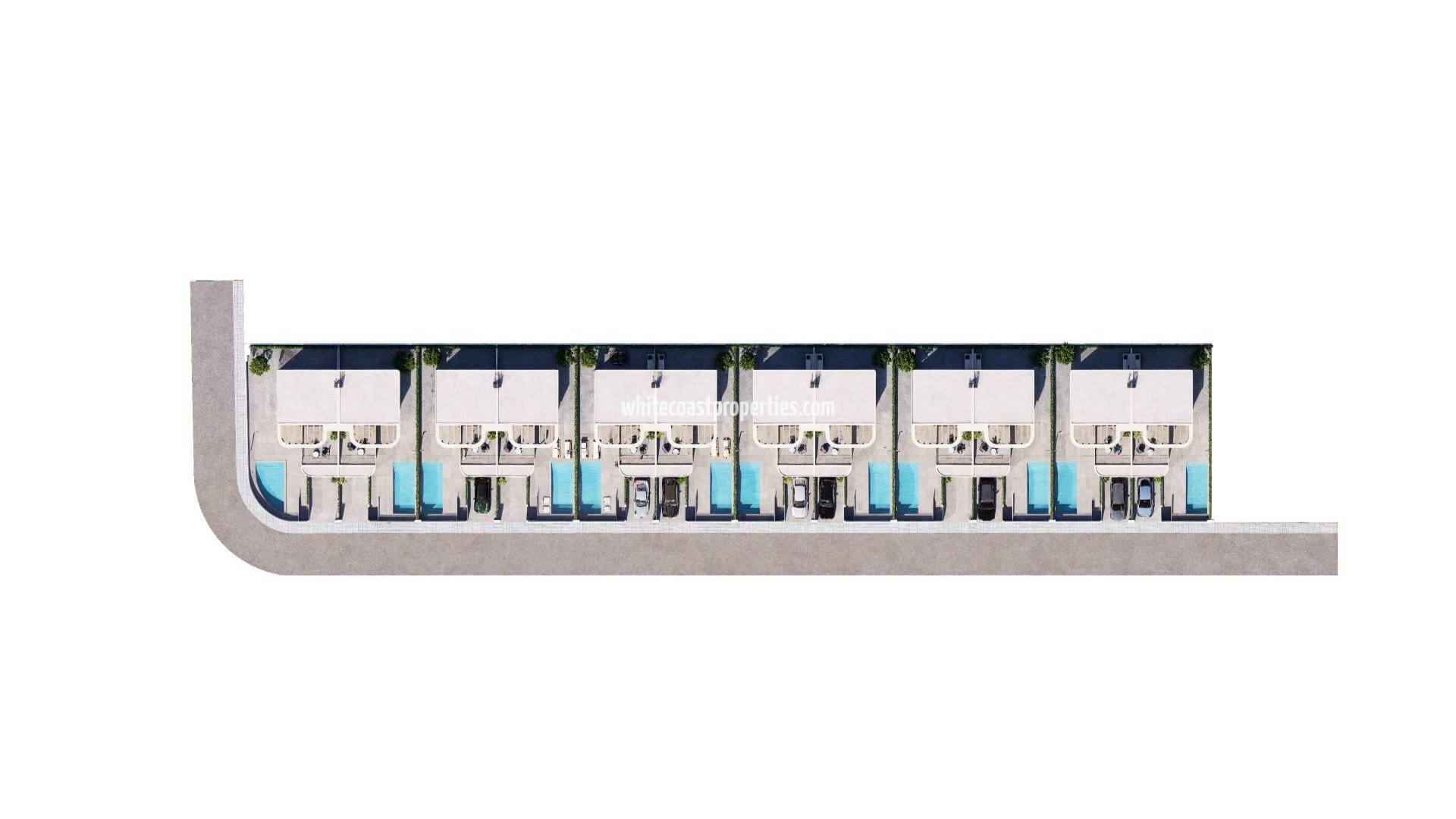 Modernas villas adosadas en Daya Nueva con diseño contemporáneo y excelentes conexiones Vida tranquila en Daya Nueva Estas nuevas villas adosadas se encuentran en la encantadora localidad de Daya Nueva, al sur de Alicante. Conocida por su tranquilo ambiente rural, Daya Nueva ofrece un estilo de vida cómodo rodeado de huertos y paisajes abiertos, a poca distancia en coche de las animadas zonas costeras de la Costa Blanca. La localidad cuenta con servicios esenciales, restaurantes y tiendas locales, y se encuentra a solo 10 km de las playas de La Marina del Pinet y Guardamar del Segura. El aeropuerto internacional de Alicante está a unos 25 km, lo que lo hace muy accesible para los propietarios internacionales. Los amantes del golf apreciarán estar a 12 km de La Marquesa Golf y a 15 km de Vistabella Golf. Arquitectura elegante y construcción de calidad Esta exclusiva promoción ha sido diseñada con gran atención al detalle, incorporando un estilo arquitectónico luminoso, fresco y moderno. Las líneas curvas de la fachada crean un aspecto contemporáneo único, mientras que los acabados de alta calidad garantizan un confort duradero. Distribución funcional en dos plantas Cada villa se distribuye en dos niveles en la nueva zona residencial de Daya Nueva, a poca distancia del centro de la ciudad. La planta baja incluye una sala de estar y comedor con cocina abierta, acceso directo al jardín, un dormitorio con baño en suite y vestidor, un aseo de invitados y una plaza de aparcamiento privada en la parcela. Se puede añadir una piscina privada con un coste adicional. La planta superior cuenta con dos dormitorios más, un cuarto de baño completo y una terraza abierta de 19 m2 con agradables vistas. Comodidad y características modernas Las viviendas están equipadas con cuartos de baño amueblados, incluyendo muebles, espejos y mamparas de ducha. Otras características adicionales son la preinstalación de aire acondicionado por conductos, cocinas amuebladas, persianas eléctricas en los dormitorios, iluminación LED interior y exterior y tres paneles solares fotovoltaicos. Ubicación ideal para la vida costera y rural Las villas están situadas en una nueva y tranquila zona residencial con fácil acceso a la autopista A 70. Las playas, los campos de golf, los puertos deportivos y las ciudades cercanas se encuentran a poca distancia, lo que la convierte en una ubicación ideal tanto para las vacaciones como para vivir todo el año. Póngase en contacto con nosotros hoy mismo para concertar una visita y asegurarse su nueva vivienda en Daya Nueva.