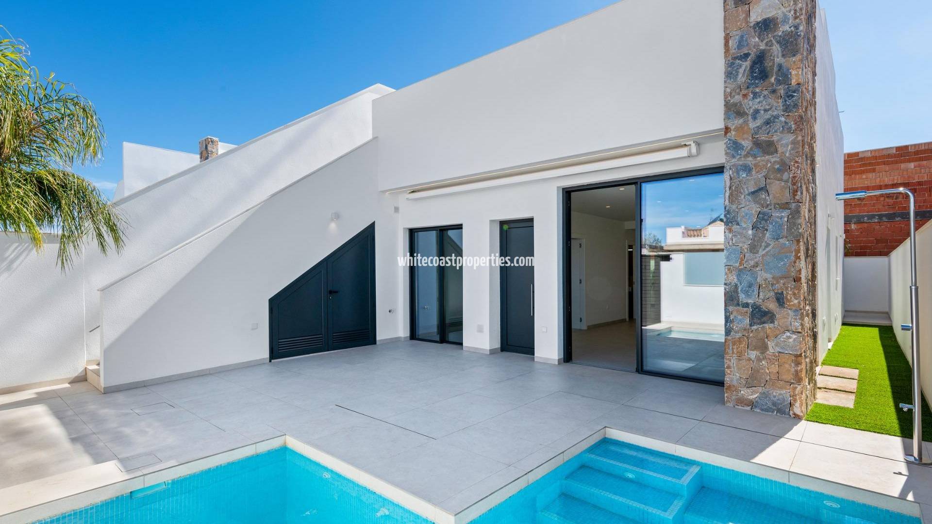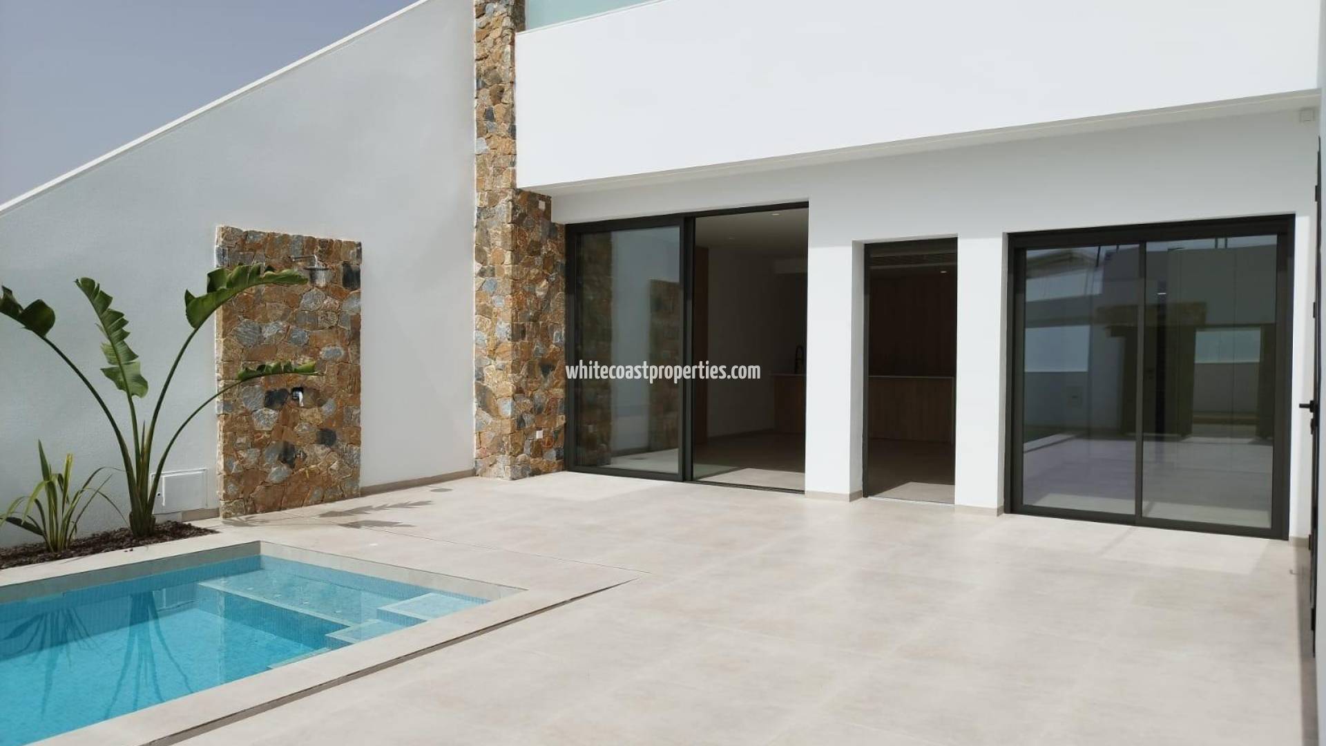 VILLAS PAREADAS DE OBRA NUEVA EN SAN JAVIER Residencial de obra nueva de villas independientes y pareadas en San Javier. Villas construidas en 1 planta y consta de 3 dormitorios, 2 baños, cocina americana, el salón con vistas abiertas a la terraza, solarium, jardín privado con la piscina. Cocina totalmente amueblada en color blanco brillo o madera incluye Placa de inducción con extractor integrado, horno, microondas, lavadora, frigorífico integrado y lavavajillas integrado. Instalación completa de Aire Acondicionado por conductos. La piscina tiene preinstalación para bomba de calor. San Javier está cerca de todos los servicios con fácil acceso a la playa, deportes acuáticos, tiendas y la red de transporte. Aquí se puede disfrutar de todas las instalaciones que San Javier tiene para ofrecer, como las tiendas locales, bares y restaurantes, así como estar cerca de centros comerciales, el aeropuerto de Murcia y todos los hermosos lugares que se encuentran a lo largo del Mar Menor. El aeropuerto de Corvera/Murcia está a 30 minutos y el aeropuerto de Alicante a 45 minutos.