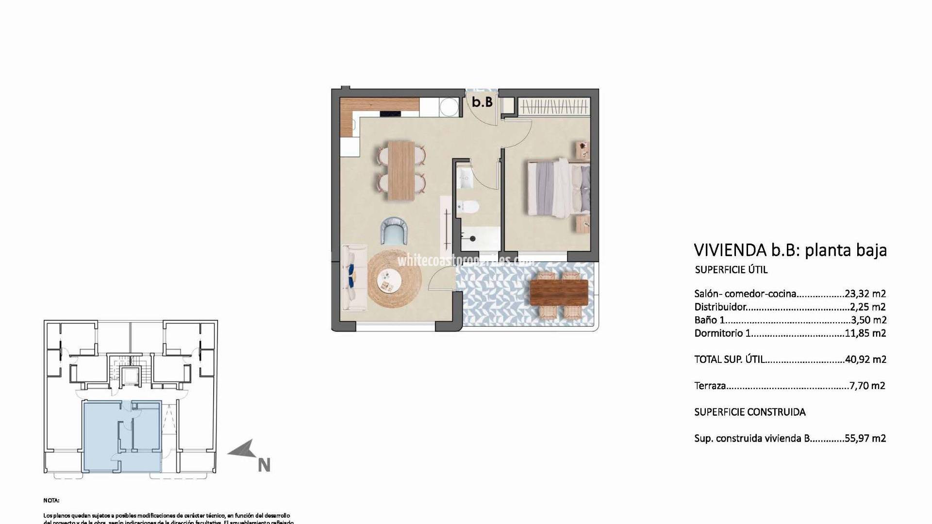 Nuevos apartamentos mediterráneos a solo 140 m de la playa en Torre de la Horadada Vida exclusiva junto al mar en la Costa Blanca Descubra este nuevo proyecto residencial en Torre de la Horadada, con una ubicación ideal a solo 140 metros del mar, entre las Playas de El Conde y de El Puerto y junto al puerto deportivo. Esta exclusiva promoción cuenta con solo 8 modernos apartamentos de estilo mediterráneo, que ofrecen una combinación única de encanto costero y comodidad contemporánea en una de las ubicaciones más codiciadas de la Costa Blanca Sur. Situadas en un tranquilo y pintoresco pueblo costero, estas viviendas están rodeadas de servicios esenciales como supermercados, restaurantes, cafeterías y tiendas, todos ellos a poca distancia a pie. La zona es conocida por su ambiente relajado, sus aguas cristalinas y su entorno familiar. Diseño elegante y acabados de calidad Cada apartamento cuenta con 1, 2 o 3 dormitorios y 1 o 2 baños, cuidadosamente diseñados para maximizar el espacio y la luz natural. Los interiores cuentan con: Puerta de entrada de seguridad para mayor tranquilidad Armarios empotrados en los dormitorios, totalmente revestidos y acabados Baños modernos equipados con muebles, espejos y mamparas de ducha Preinstalación de aire acondicionado por conductos para disfrutar de confort durante todo el año Estos acabados de alta calidad crean espacios luminosos y funcionales, perfectos tanto para residencia permanente como para uso vacacional. Solárium en la azotea con piscina y zona chill-out La característica más destacada de esta promoción es el solárium comunitario en la azotea, al que se puede acceder por escaleras o ascensor. Los residentes pueden disfrutar de una piscina en la azotea, una zona de cocina al aire libre, barbacoa y comedores bajo pérgolas, y una zona para tomar el sol con césped artificial. Este exclusivo oasis en la azotea es el lugar perfecto para relajarse bajo el sol español. Ubicación privilegiada y excelentes conexiones Torre de la Horadada es conocida por su impresionante costa, su puerto deportivo y su animado paseo marítimo. La promoción ofrece fácil acceso a destinos cercanos: Playas: 100 m Campo de golf Lo Romero: 7 km San Pedro del Pinatar: 5 km Aeropuerto de Murcia-Corvera: 40 minutos (55 km) Aeropuerto de Alicante: 55 minutos (75 km) La casa de playa de sus sueños le espera Con su inmejorable ubicación, su elegante diseño y sus excepcionales servicios comunitarios, este nuevo proyecto residencial boutique en Torre de la Horadada es la oportunidad perfecta para disfrutar del estilo de vida mediterráneo. Póngase en contacto con nosotros hoy mismo para concertar una visita y asegurarse su nueva casa a pocos pasos del mar en la Costa Blanca.