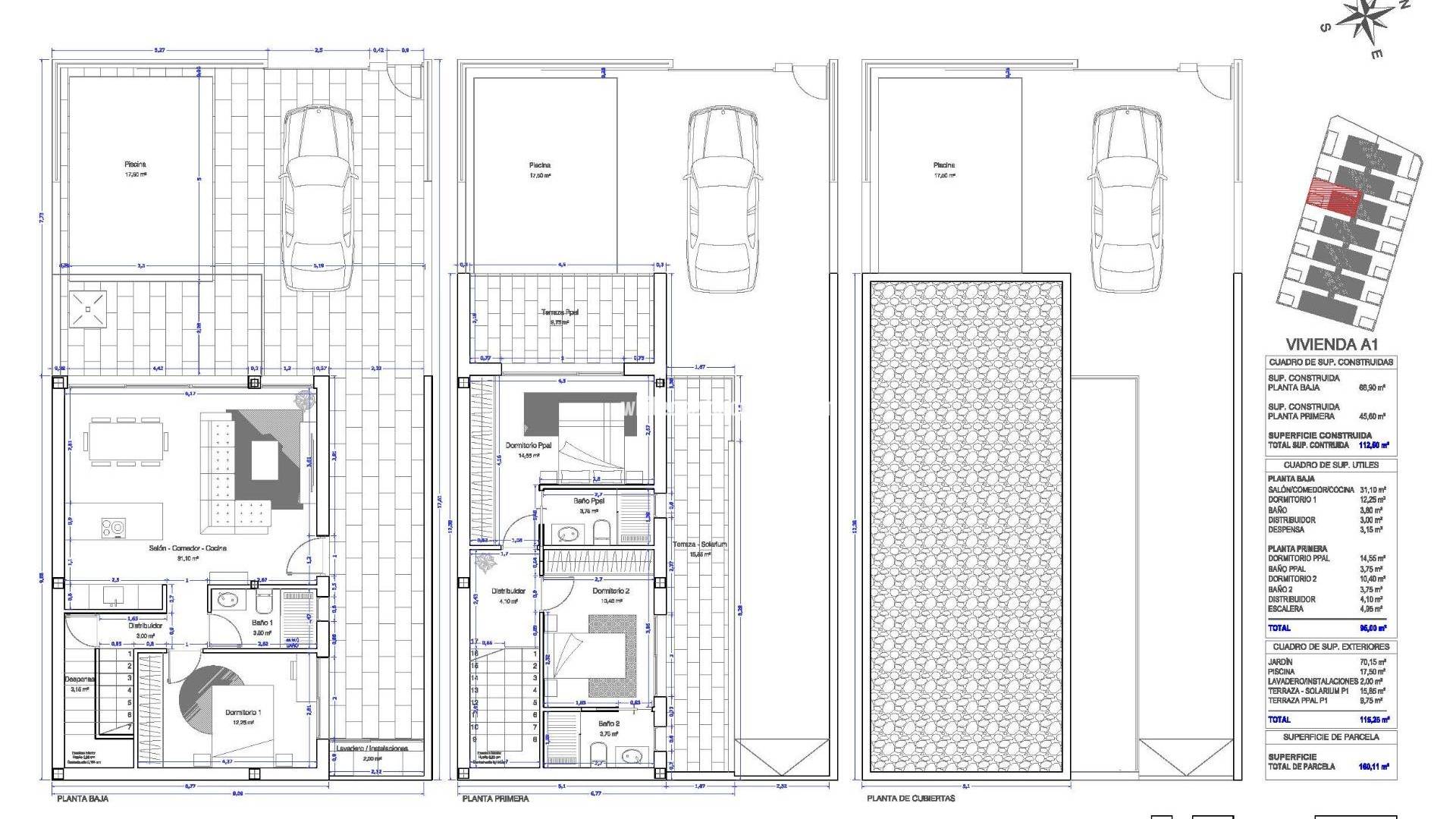Modernas villas de nueva construcción con piscina privada en San Pedro del Pinatar Diseño contemporáneo y calidad de vida superior Descubra la tercera fase de este exclusivo proyecto residencial en San Pedro del Pinatar, donde la arquitectura moderna se une al confort y la funcionalidad. Estas 14 villas adosadas están diseñadas con un estilo minimalista y acabados de alta calidad, ofreciendo una experiencia de vida elegante y sofisticada en la Costa Cálida. Cada villa cuenta con 3-4 amplios dormitorios, 3 baños, piscina privada, terrazas y jardín privado, creando el entorno perfecto para la privacidad, la relajación y la vida al aire libre mediterránea. San Pedro del Pinatar es una de las localidades más cotizadas de la zona del Mar Menor, conocida por sus salinas naturales, sus tranquilas playas y su agradable clima durante todo el año, lo que la hace ideal tanto para vivir como para pasar las vacaciones. Distribución diáfana diseñada para la vida moderna Las villas están cuidadosamente distribuidas con una cocina abierta conectada a una luminosa sala de estar y comedor. Las grandes ventanas de la sala de estar, con persianas motorizadas, proporcionan acceso directo a la zona de la piscina y permiten que la luz natural inunde los espacios interiores. Las características principales de cada propiedad incluyen: 3 dormitorios con armarios empotrados 3 baños completamente equipados con tocadores, espejos y mamparas de ducha Cocina amueblada con electrodomésticos Balay incluidos Piscina privada y zona de jardín Iluminación LED interior y exterior Terrazas en la primera planta y solárium opcional en la azotea Plaza de aparcamiento en la parcela Sistema aerotérmico para agua caliente Paneles solares fotovoltaicos para una mayor eficiencia energética Preinstalación de aire acondicionado por conductos Estas viviendas están diseñadas para combinar sostenibilidad, comodidad y estilo moderno en cada detalle. Ubicación privilegiada cerca de playas y servicios Situada entre el Mar Menor y el mar Mediterráneo, San Pedro del Pinatar es un paraíso para los amantes de la playa y los deportes acuáticos. La localidad ofrece un animado puerto deportivo, baños de barro naturales, tiendas, restaurantes, instalaciones deportivas y excelentes servicios durante todo el año. Playas del Mar Menor a 3 km Playas del Mediterráneo a 5 km Centro comercial Dos Mares a 5 km Lo Romero Golf a 10 km Roda Golf a 15 km Aeropuerto de Murcia Corvera a 30 km Aeropuerto de Alicante a 80 km Puerto deportivo de San Pedro a 4 km Una vivienda ideal para vivir y como inversión Gracias a su ubicación, diseño y características de eficiencia energética, estas villas representan una excelente oportunidad como residencia permanente, vivienda vacacional o inversión para alquilar en una de las zonas más atractivas de la Costa Cálida. Póngase en contacto con nosotros hoy mismo para obtener más información o concertar una visita y asegurarse su nueva villa en San Pedro del Pinatar.