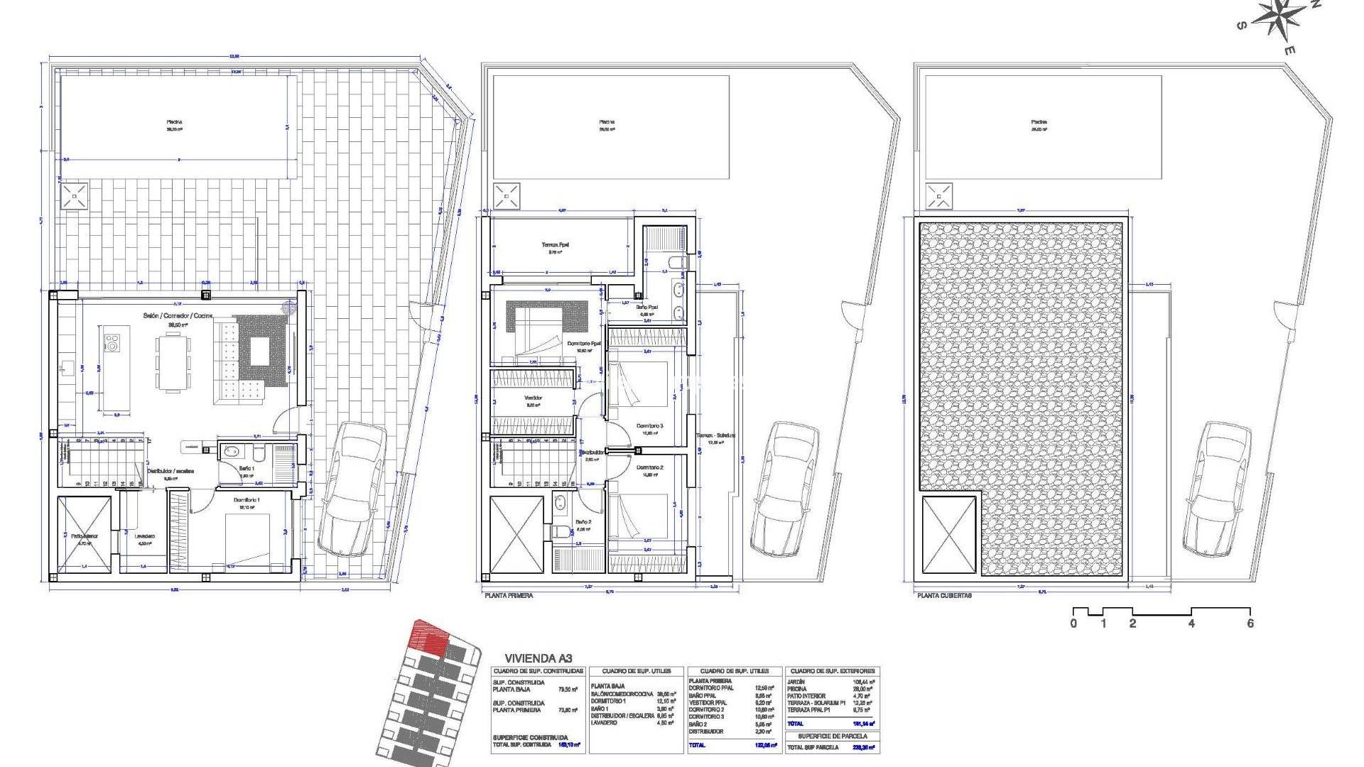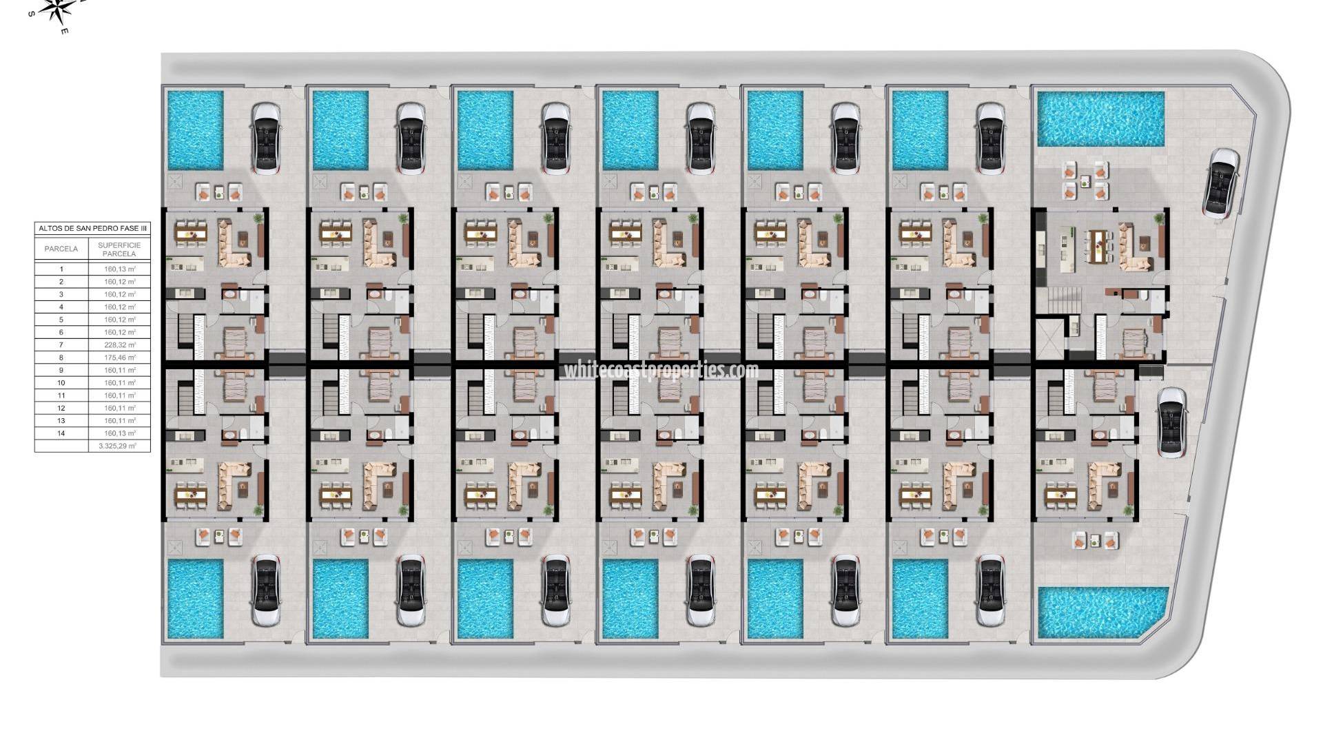 Modernas villas de nueva construcción con piscina privada en San Pedro del Pinatar Diseño contemporáneo y calidad de vida superior Descubra la tercera fase de este exclusivo proyecto residencial en San Pedro del Pinatar, donde la arquitectura moderna se une al confort y la funcionalidad. Estas 14 villas adosadas están diseñadas con un estilo minimalista y acabados de alta calidad, ofreciendo una experiencia de vida elegante y sofisticada en la Costa Cálida. Cada villa cuenta con 3-4 amplios dormitorios, 3 baños, piscina privada, terrazas y jardín privado, creando el entorno perfecto para la privacidad, la relajación y la vida al aire libre mediterránea. San Pedro del Pinatar es una de las localidades más cotizadas de la zona del Mar Menor, conocida por sus salinas naturales, sus tranquilas playas y su agradable clima durante todo el año, lo que la hace ideal tanto para vivir como para pasar las vacaciones. Distribución diáfana diseñada para la vida moderna Las villas están cuidadosamente distribuidas con una cocina abierta conectada a una luminosa sala de estar y comedor. Las grandes ventanas de la sala de estar, con persianas motorizadas, proporcionan acceso directo a la zona de la piscina y permiten que la luz natural inunde los espacios interiores. Las características principales de cada propiedad incluyen: 3 dormitorios con armarios empotrados 3 baños completamente equipados con tocadores, espejos y mamparas de ducha Cocina amueblada con electrodomésticos Balay incluidos Piscina privada y zona de jardín Iluminación LED interior y exterior Terrazas en la primera planta y solárium opcional en la azotea Plaza de aparcamiento en la parcela Sistema aerotérmico para agua caliente Paneles solares fotovoltaicos para una mayor eficiencia energética Preinstalación de aire acondicionado por conductos Estas viviendas están diseñadas para combinar sostenibilidad, comodidad y estilo moderno en cada detalle. Ubicación privilegiada cerca de playas y servicios Situada entre el Mar Menor y el mar Mediterráneo, San Pedro del Pinatar es un paraíso para los amantes de la playa y los deportes acuáticos. La localidad ofrece un animado puerto deportivo, baños de barro naturales, tiendas, restaurantes, instalaciones deportivas y excelentes servicios durante todo el año. Playas del Mar Menor a 3 km Playas del Mediterráneo a 5 km Centro comercial Dos Mares a 5 km Lo Romero Golf a 10 km Roda Golf a 15 km Aeropuerto de Murcia Corvera a 30 km Aeropuerto de Alicante a 80 km Puerto deportivo de San Pedro a 4 km Una vivienda ideal para vivir y como inversión Gracias a su ubicación, diseño y características de eficiencia energética, estas villas representan una excelente oportunidad como residencia permanente, vivienda vacacional o inversión para alquilar en una de las zonas más atractivas de la Costa Cálida. Póngase en contacto con nosotros hoy mismo para obtener más información o concertar una visita y asegurarse su nueva villa en San Pedro del Pinatar.