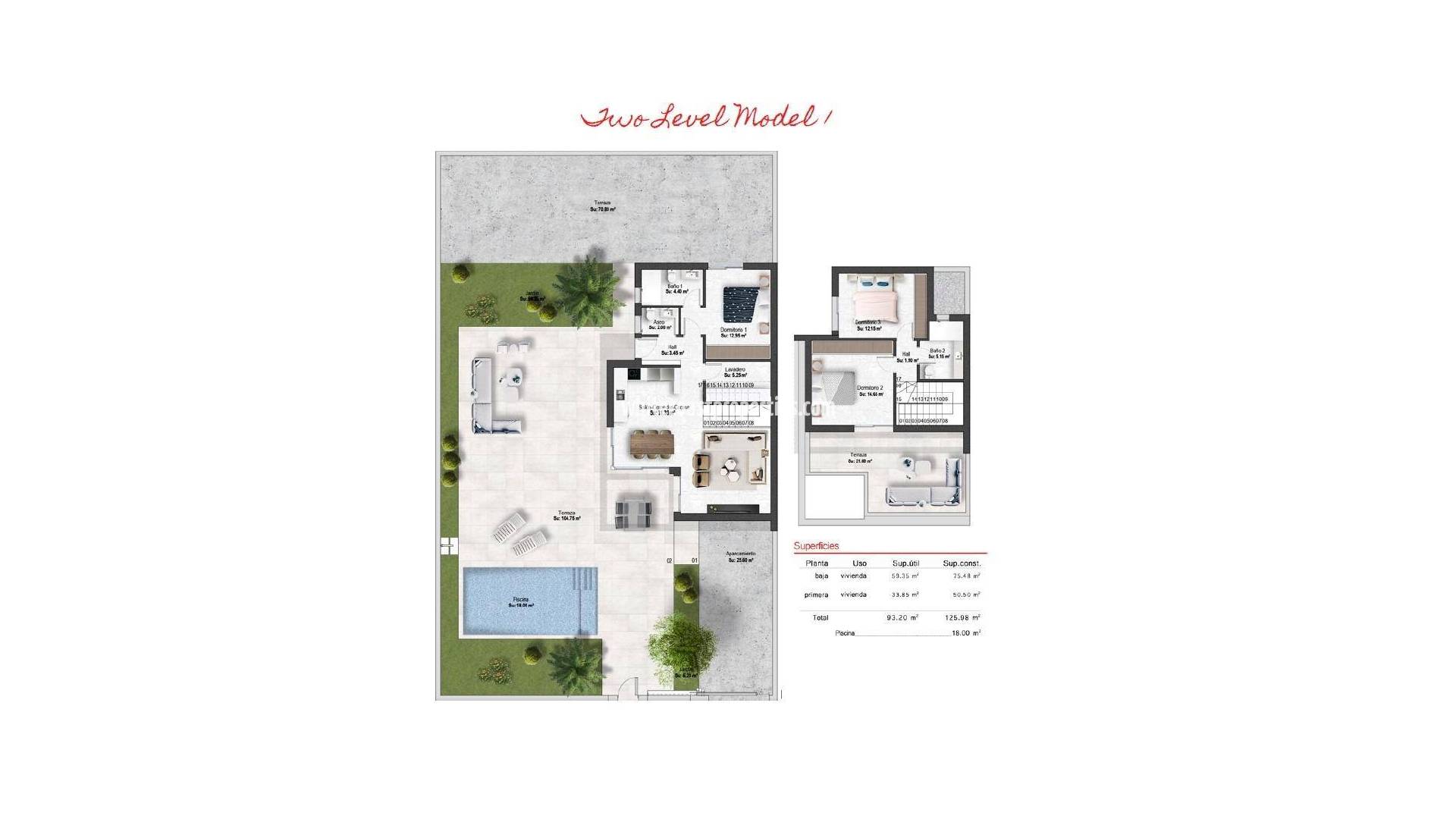 Villas de nueva construcción en Altaona Golf Resort, Murcia, con piscina privada y vistas a la montaña Villas contemporáneas en Altaona Golf Resort, Murcia Descubra una exclusiva promoción de villas modernas situada en Altaona Golf Resort, una de las zonas residenciales más atractivas de Murcia. Rodeado de paisajes naturales y montañas, este complejo de golf seguro ofrece un entorno tranquilo, a la vez que se encuentra a poca distancia en coche de la ciudad de Murcia y de la costa mediterránea. Estas villas de nueva construcción están diseñadas para ofrecer comodidad, privacidad y un relajado estilo de vida mediterráneo. La promoción ofrece una selección de villas de una sola planta con solárium opcional o de dos plantas, todas con tres dormitorios y dos baños, incluido un dormitorio principal con baño en suite. Diseño espacioso con jardines privados y piscina Cada villa está construida en una parcela privada a partir de 300 m², lo que ofrece un amplio espacio exterior para disfrutar del sol durante todo el año. Las propiedades incluyen una piscina privada, zonas ajardinadas y aparcamiento en la propia parcela. La distribución interior está diseñada para maximizar la luz natural y crear una conexión fluida entre la vida interior y exterior. Las zonas de salón y comedor de planta abierta conectan directamente con la terraza y la piscina, creando el escenario perfecto para relajarse o recibir a familiares y amigos. Acabados de calidad y prestaciones modernas Estas villas se han construido utilizando materiales de alta calidad y técnicas de construcción modernas para garantizar el confort y la eficiencia energética. Entre las prestaciones se incluyen una puerta de entrada de seguridad reforzada, cocina totalmente equipada con electrodomésticos, calefacción por suelo radiante en los baños y un paquete de iluminación LED interior. Otras especificaciones incluyen la preinstalación para aire acondicionado por conductos y la producción de agua caliente mediante un sistema aerotérmico de alta eficiencia energética, lo que proporciona tanto sostenibilidad como ahorro de costes. Ubicación privilegiada cerca del golf, la ciudad y la costa Altaona Golf Resort es conocido por su campo de golf de 18 hoyos, su entorno tranquilo y su excelente seguridad, lo que lo hace ideal tanto para residencias permanentes como para casas de vacaciones. El complejo ofrece una combinación única de naturaleza, deporte y proximidad a destinos clave. El centro de la ciudad de Murcia se encuentra a solo 15 km, y ofrece una amplia variedad de tiendas, restaurantes, atracciones culturales y servicios. Las playas del Mar Menor y la costa mediterránea están a unos 20 km, perfectas para disfrutar de días soleados junto al mar. Otras distancias clave incluyen el aeropuerto de Murcia-Corvera a 15 km, la ciudad de Cartagena a 35 km y varios campos de golf a poca distancia en coche, lo que convierte a este lugar en una ubicación ideal para los amantes del golf y los compradores internacionales. Una oportunidad ideal de inversión y de estilo de vida mediterráneo Estas villas de nueva construcción en Altaona Golf Resort ofrecen una excelente oportunidad para disfrutar de un estilo de vida de alta calidad en un entorno natural y seguro, con fácil acceso tanto a la ciudad como a la costa. Póngase en contacto con nosotros hoy mismo para obtener más información o concertar una visita y descubrir su nuevo hogar en Murcia.