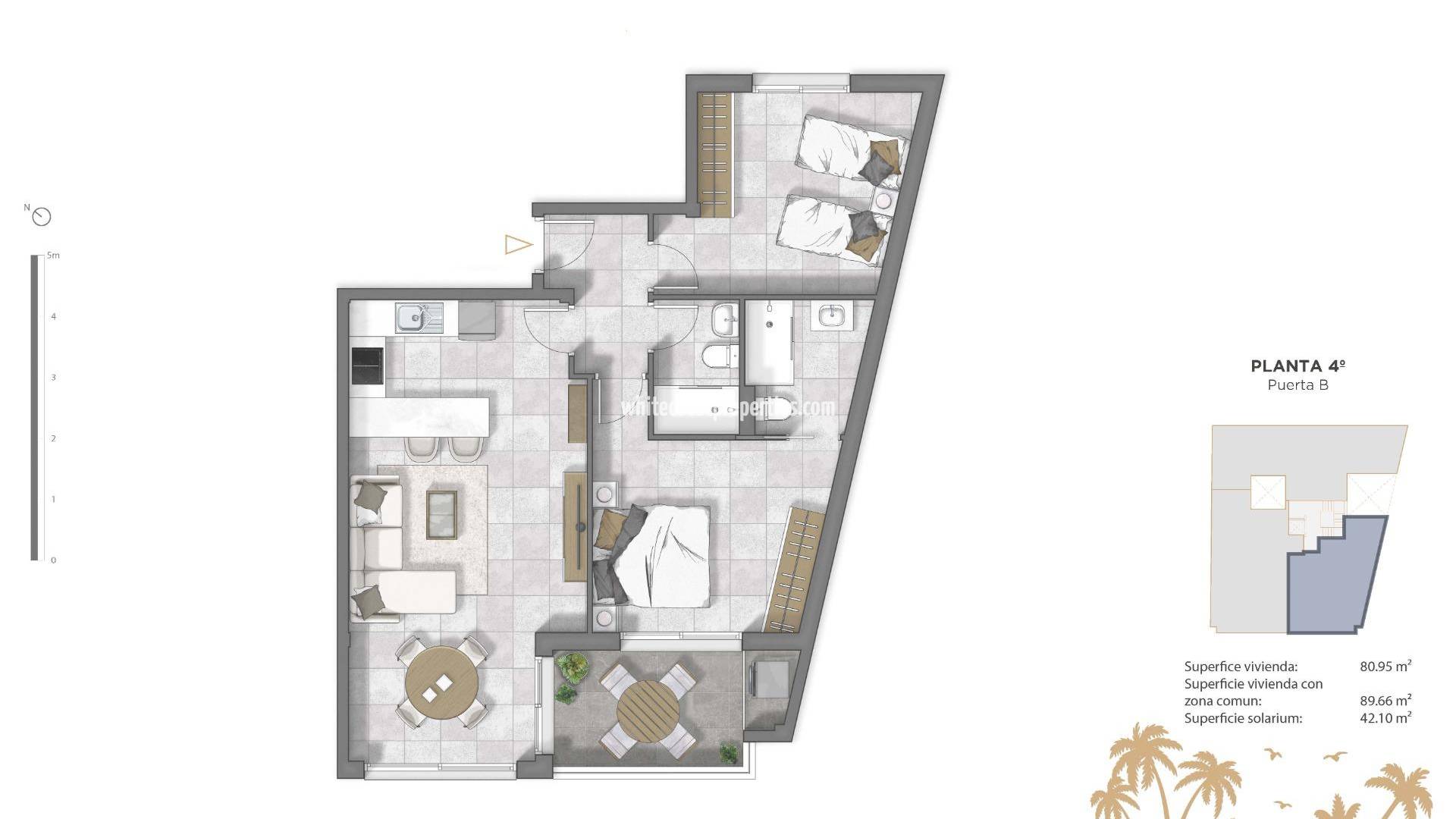 Apartamentos de nueva construcción en el centro de Guardamar del Segura, Costa Blanca Ubicación privilegiada cerca de la playa Descubra este excepcional complejo residencial de nueva construcción situado en el corazón de Guardamar del Segura, una encantadora ciudad costera famosa por sus dunas naturales, bosques de pinos y playas de arena dorada. Con una ubicación ideal a solo 1 km de la playa y a poca distancia de tiendas, restaurantes, supermercados y servicios de ocio, este proyecto ofrece el equilibrio perfecto entre comodidad y estilo de vida mediterráneo. Viviendas elegantes diseñadas para el confort Esta moderna promoción consta de apartamentos de 2 y 3 dormitorios con 2 baños (uno de ellos en suite). Los compradores pueden elegir entre viviendas en planta baja con terraza y patio, apartamentos en plantas intermedias con terraza o áticos con solárium privado, ideales para disfrutar del sol y la brisa marina durante todo el año. Cada propiedad incluye una cocina abierta integrada en un amplio salón, armarios empotrados y un trastero privado en la azotea. Hay plazas de aparcamiento opcionales en la planta baja para mayor comodidad. Calidades premium y eficiencia energética Diseñadas para ofrecer comodidad y eficiencia modernas, las viviendas incluyen acabados de alta calidad: Baños totalmente equipados con mueble de lavabo, espejo y mamparas Puerta de entrada reforzada de seguridad Sistema de agua caliente aerotérmica Ventanas de doble acristalamiento con rotura de puente térmico Ascensor con acceso a todas las plantas Bonitos espacios comunes El complejo cuenta con atractivas zonas verdes, una piscina comunitaria y un solárium comunitario en la azotea, lo que proporciona a los residentes relajantes espacios al aire libre bajo el sol. Disfrute de lo mejor de Guardamar Guardamar del Segura ofrece 11 km de playas naturales, un puerto deportivo con actividades durante todo el año, instalaciones deportivas con pádel, tenis, fútbol y una piscina cubierta climatizada, así como parques, mercados y lugares de interés cultural. Con su ambiente costero relajado y su completa oferta de servicios, es un lugar ideal tanto para vivir como para pasar las vacaciones. Distancias clave: Playa: 1 km Aeropuerto de Alicante-Elche: 20 km La Marquesa Golf: 8 km Puerto deportivo de Torrevieja: 14 km Puerto deportivo de Guardamar: 2 km Asegúrese su nueva vivienda en la Costa Blanca No pierda la oportunidad de vivir en una de las zonas más deseadas de la Costa Blanca. Póngase en contacto con nosotros hoy mismo para concertar una visita y descubrir su futura vivienda en Guardamar del Segura.