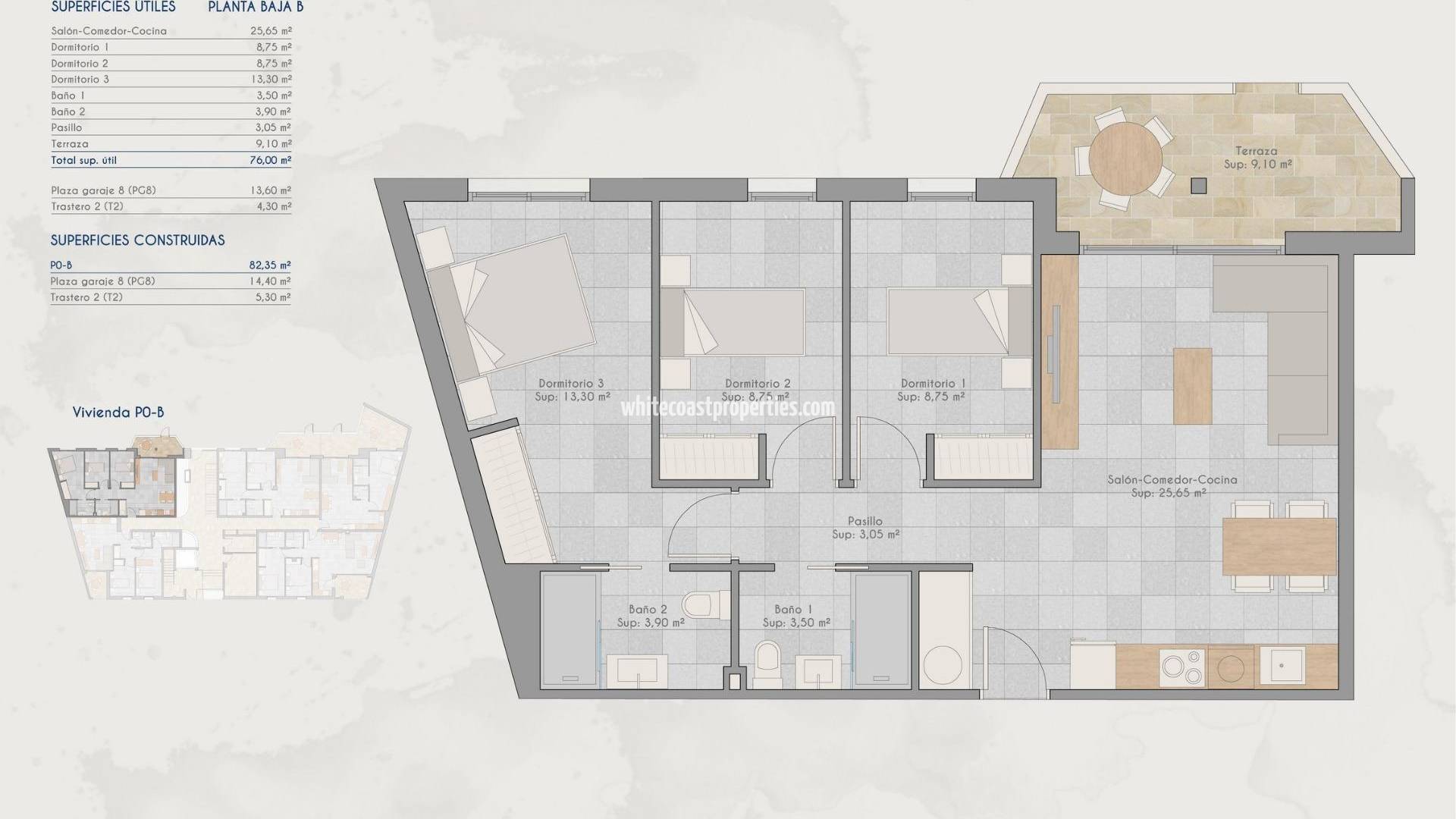 Apartamentos de nueva construcción en venta en Lo Pagan (San Pedro del Pinatar) cerca de la playa Vida mediterránea moderna en Lo Pagan Descubra estos elegantes apartamentos de nueva construcción en venta en Lo Pagan, una encantadora zona costera dentro de San Pedro del Pinatar, en la hermosa Costa Cálida. Situada en el conocido barrio de Los Cuarteros, esta promoción residencial ofrece un estilo de vida privilegiado a solo 500 metros de la playa y cerca de todos los servicios esenciales, restaurantes, tiendas y zonas de ocio. Lo Pagan es famosa por su relajado ambiente costero, las tranquilas aguas del Mar Menor y más de 300 días de sol al año. La zona combina el encanto tradicional español con las comodidades modernas, lo que la convierte en un destino ideal tanto para vivir como para pasar las vacaciones. Apartamentos contemporáneos con terrazas y soláriums privados La promoción ofrece una selección de apartamentos en planta baja y planta intermedia con amplias terrazas, así como exclusivos áticos con soláriums privados en la azotea. Los soláriums incluyen una pérgola y una zona de barbacoa, lo que crea el entorno perfecto para comer al aire libre y relajarse bajo el sol del Mediterráneo. Cada propiedad ha sido diseñada para combinar la arquitectura contemporánea con el cálido estilo mediterráneo. La cocina abierta se integra a la perfección con el salón y el comedor, creando espacios luminosos y confortables. Las amplias terrazas amplían las zonas interiores y son el lugar perfecto para desayunar al aire libre o celebrar reuniones por la noche. Los dormitorios cuentan con armarios empotrados y los modernos cuartos de baño están totalmente equipados, ofreciendo comodidad y elegantes acabados en toda la vivienda. Características de calidad e instalaciones comunitarias Estas viviendas se han construido prestando atención a los detalles e incluyen especificaciones de alta calidad para garantizar el confort y la eficiencia. Cocina totalmente amueblada y equipada con electrodomésticos Baños completamente equipados con acabados modernos Aire acondicionado por conductos totalmente instalado Plaza de aparcamiento privada y trastero incluidos en cada propiedad Los residentes también pueden disfrutar de excelentes instalaciones comunitarias, como una piscina rodeada de zonas de relax y un gimnasio totalmente equipado, ideal para mantener un estilo de vida activo durante todo el año. Excelente ubicación en la Costa Cálida Esta promoción goza de una ubicación estratégica cerca de playas, campos de golf y destinos clave a lo largo de la costa. Playa de Villananitos 0,5 km Real Club Náutico de Lo Pagán 0,5 km Lo Romero Golf 10 km Aeropuerto Internacional de Murcia 40 km Cartagena 35 km Las playas cercanas del Mar Menor, como la Playa de La Puntica, son conocidas por su arena fina y sus aguas tranquilas, ideales para nadar, navegar y practicar deportes acuáticos. Su nueva casa junto al mar le espera Disfrute del sol, las playas y un vibrante estilo de vida costero en una de las zonas más codiciadas de la Costa Cálida. Póngase en contacto con nosotros hoy mismo para obtener más información sobre estos apartamentos de nueva construcción en Lo Pagán y asegúrese su lugar junto al mar.