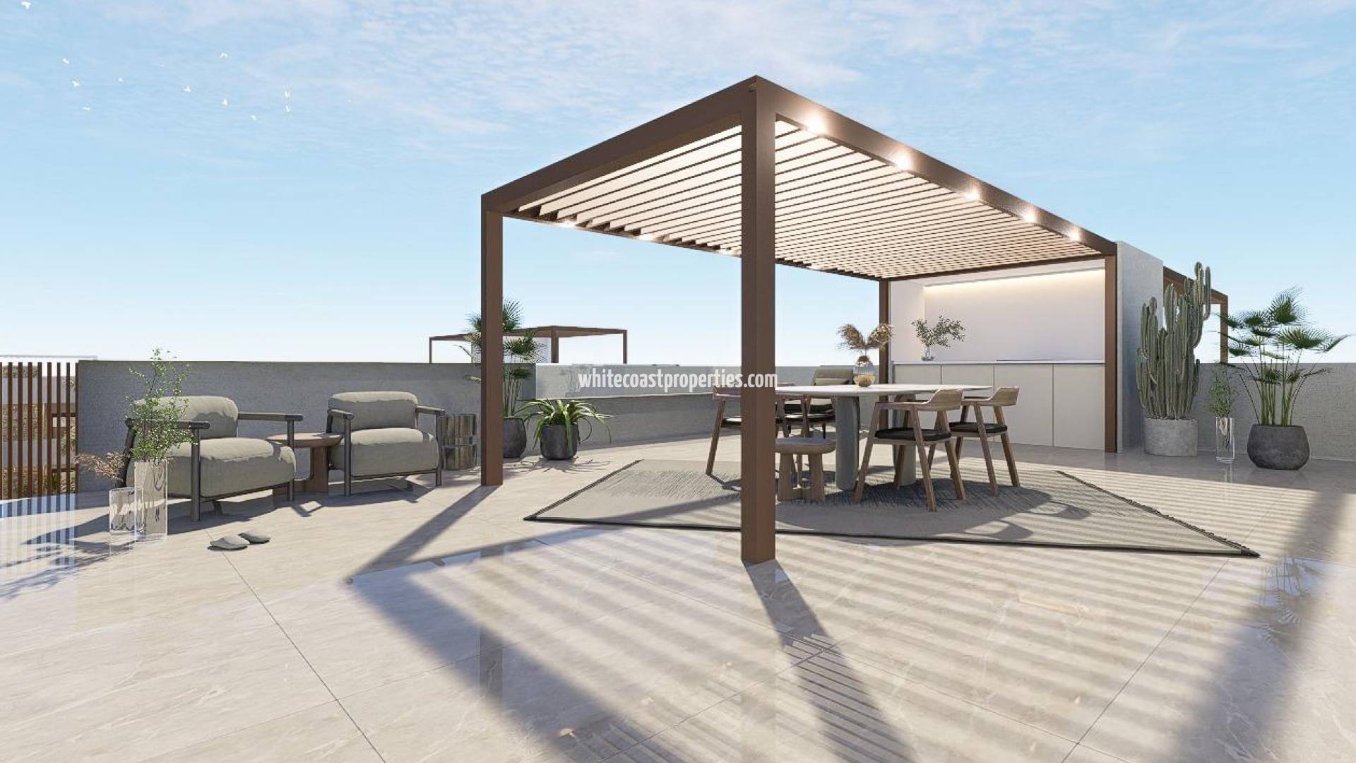 New Build Bungalows with Comunal Pool in Pilar de la Horadada – Costa Blanca South Modern Residences Close to the Beach and Town Centre Discover this exclusive new development of 16 modern bungalows located in Pilar de la Horadada, a charming town in the southernmost part of the Costa Blanca. The residential complex offers properties with 2 or 3 bedrooms and 2 fully equipped bathrooms, designed to combine comfort, functionality, and Mediterranean style. The development is situated just 3.5 km from the beaches of Torre de la Horadada, and within walking distance to the town centre, where you’ll find supermarkets, restaurants, shops, and all essential services. Premium Features and Functional Design Each bungalow is built with quality materials and designed for year-round living or holiday enjoyment. Key features include: Ground floor units with private garden Top floor units with private solarium and summer kitchen Fully furnished kitchen with appliances included Fitted wardrobes with drawers Modern bathrooms with Rain-effect showers, mirrors, and screens Pre-installed ducted air conditioning 110-litre aerothermal hot water system for energy efficiency Outdoor and indoor lighting (excluding decorative fixtures) Aluminium exterior carpentry with thermal break and double glazing Assigned parking space for each unit Communal swimming pool for residents These homes are ideal for those seeking an easy-to-maintain property near the coast, perfect for permanent living, holidays, or as an investment for short or long-term rental. Ideal Location for a Relaxed Mediterranean Lifestyle Pilar de la Horadada offers a peaceful yet vibrant setting with a strong sense of community. The town is well-connected and known for its wide main avenue, local artisan shops, and numerous cafes and tapas bars. The area boasts an excellent network of cycling paths and walking trails, plus a variety of sports facilities and year-round activities. Key distances: Torre de la Horadada and Mil Palmeras beaches – 3.5 km (5 min by car) Lo Romero Golf Course – 7 km (10 min by car) La Zenia Boulevard Shopping Centre – 15 km (15 min by car) Murcia Airport (Corvera) – 40 km (40 min by car) Alicante Airport – 55 km (55 min by car) Secure Your Place on the Costa Blanca Whether you're looking for a vacation retreat, an investment property, or your new home in the sun, these stylish bungalows in Pilar de la Horadada are an excellent choice. Contact us today for more information or to schedule a visit!