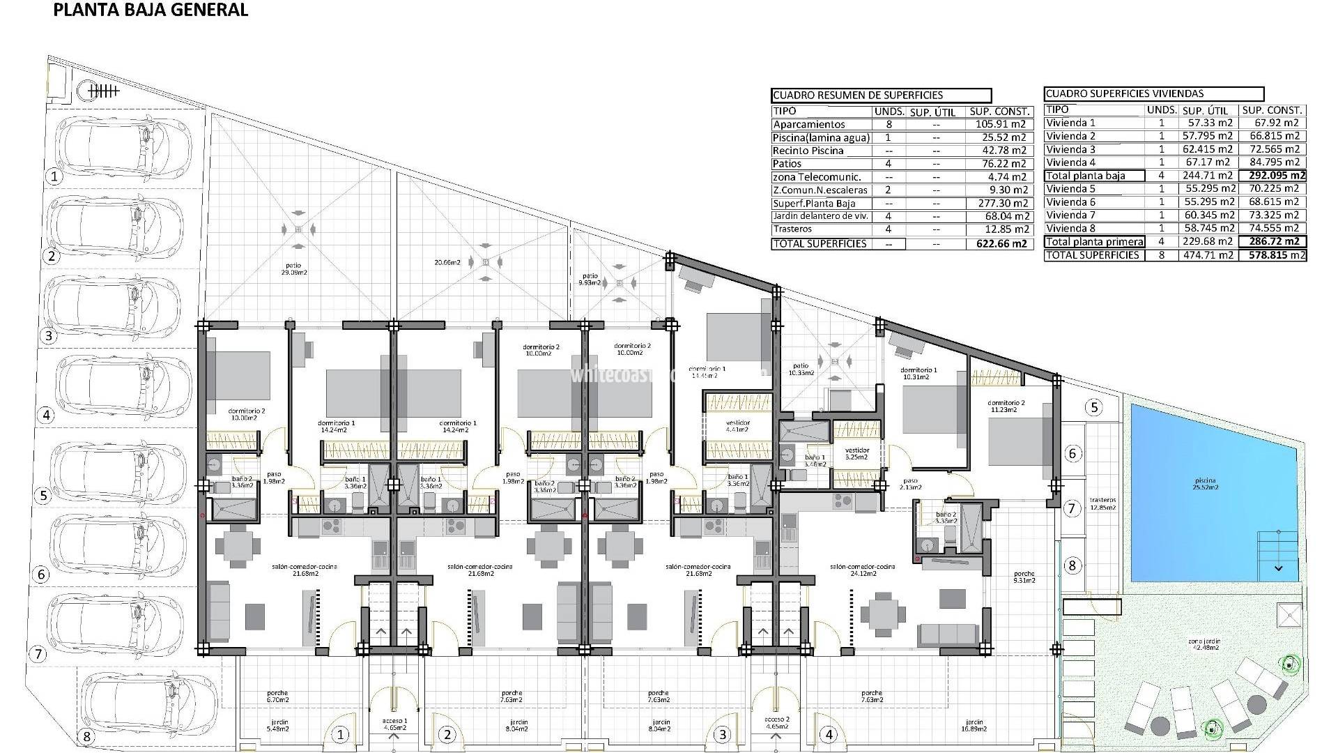 New Build Bungalows in San Pedro del Pinatar – Prime Location Just 500m from the Beach Exclusive Boutique-Style Homes Near the Coast Discover these elegant new construction bungalows in the heart of San Pedro del Pinatar, just 500 meters from the stunning beaches of the Mar Menor. This boutique development includes only eight signature homes, combining modern design, comfort, and a tranquil coastal lifestyle. Available Models to Suit Your Lifestyle Garden/Ground Floor Model: Features a front terrace and a spacious rear patio, perfect for outdoor living. Penthouse Loft Model: Includes a private rooftop solarium and a front terrace, offering open views and an abundance of sunlight. Garden/Ground Floor Model Details Step into a bright living space that seamlessly connects to the dining area and a fully fitted kitchen. Large sliding glass doors let in natural light, creating an open and inviting ambiance. The layout includes two spacious bedrooms, with the master bedroom boasting an en-suite bathroom, as well as a modern family bathroom. Penthouse Model Highlights Access the penthouse via a private staircase leading to a large terrace. Inside, an open-plan lounge and dining area blend with a fully fitted kitchen. Two bedrooms are included, with the master bedroom offering an en-suite. A private rooftop solarium, accessible from the kitchen, provides an ideal spot for relaxation or entertaining. Additional ground-floor storage ensures convenience. Key Features and Amenities Internal and external LED lighting. Fully fitted kitchen with induction hob, oven, dishwasher, and fridge/freezer. Air conditioning installed. Designated parking space. Landscaped communal garden with a swimming pool for residents. San Pedro del Pinatar: Coastal Charm and Convenience Located on the beautiful Mar Menor and Mediterranean coastlines, San Pedro del Pinatar is a haven for watersports, sailing enthusiasts, and beach lovers. The nearby Lo Pagán area offers natural mud baths, calm waters, and year-round amenities, including shops, restaurants, and leisure facilities. Distances to Key Points of Interest: Dos Mares Shopping Center: 5 km Murcia/Corvera Airport: 30 km Alicante Airport: 75 km Local golf courses: 10–20 km Marina and sailing clubs: 2 km Reserve Your Dream Home Today With completion scheduled for late 2025, now is the perfect time to secure your new home in San Pedro del Pinatar. Don’t miss this opportunity to enjoy a blend of modern elegance and coastal tranquility. Contact us today to learn more or arrange a visit!