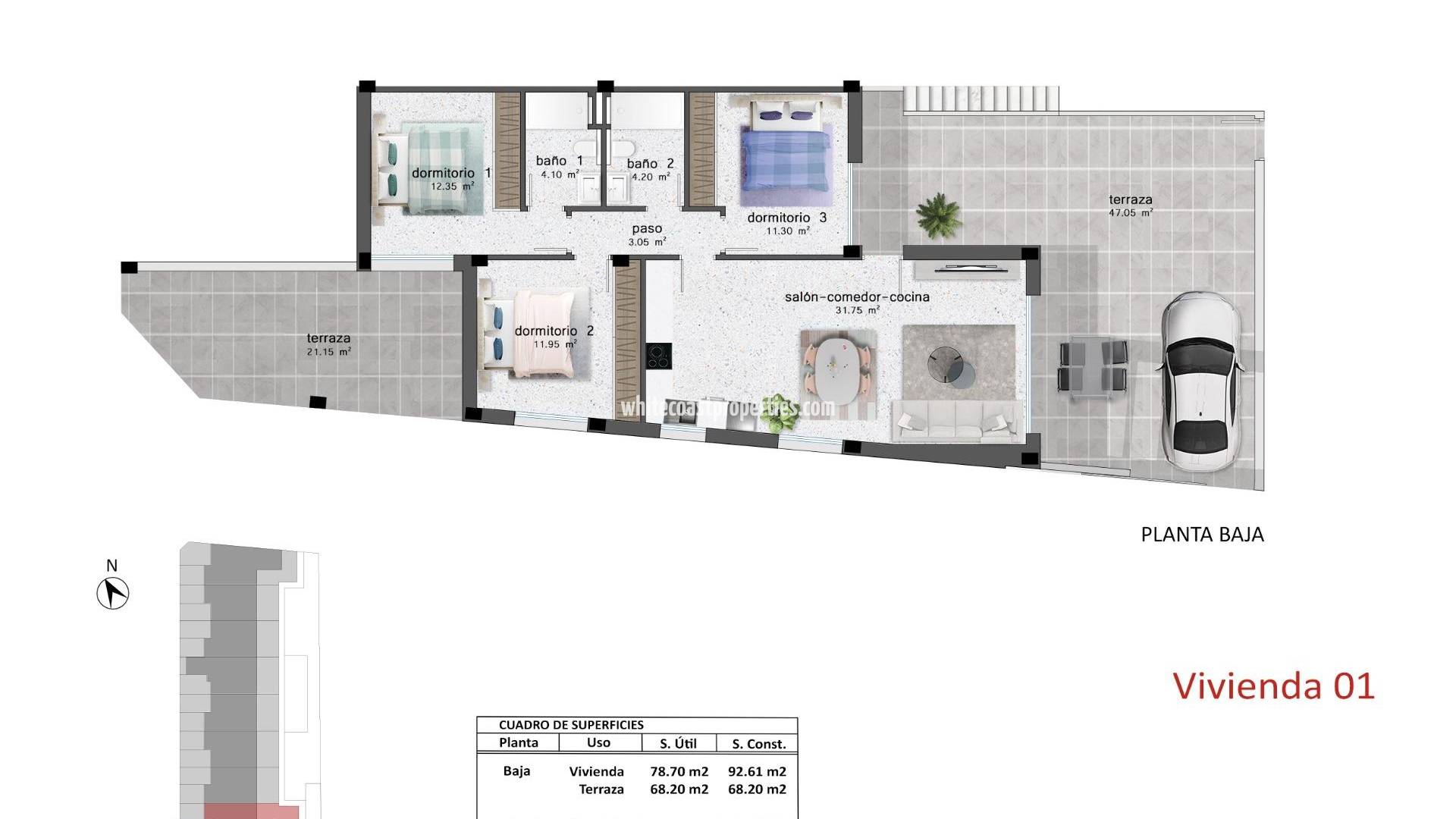 New Build Bungalow Residential Complex in Pilar de la Horadada Exclusive Modern Bungalows in Pilar de la Horadada This new development offers 16 stylish bungalows in the desirable town of Pilar de la Horadada, located in the southernmost part of Costa Blanca. Choose between 2 or 3-bedroom options, each featuring 2 bathrooms. Ground-floor units come with spacious front and rear terraces, providing direct access to the communal pool and garden, while top-floor units boast a large private rooftop solarium. Spacious Living with Modern Features Each bungalow includes a bright and open living/dining area and a fully equipped kitchen with large sliding doors that connect the indoor and outdoor spaces seamlessly. Bedrooms feature built-in wardrobes. Ducted air conditioning is installed, and the complex includes an elevator for easy access to upper floors. Private parking spaces are also included for all units. Prime Location in Pilar de la Horadada Pilar de la Horadada is a traditional Spanish town with a lively main street offering supermarkets, shops, restaurants, and bars. The beautiful beaches of Torre de la Horadada and Mil Palmeras are just 5 minutes away. The development is conveniently located 40 km from Corvera Airport (Murcia) and 55 km from Alicante Airport, making it an ideal location for both permanent living and holiday getaways.