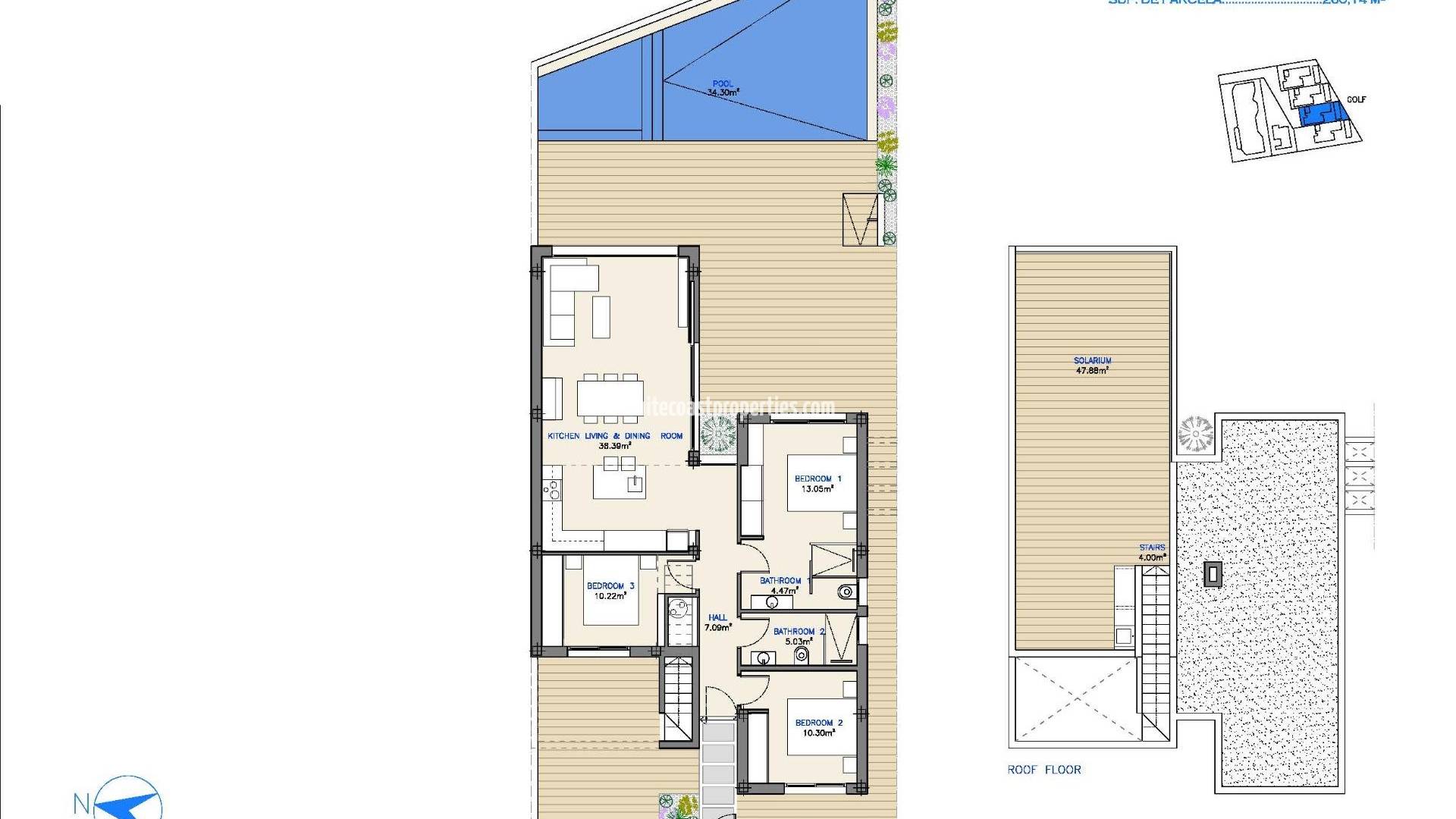 New Build Golf Front Line Villas in Los Alcázares, Costa Cálida Exclusive Living Near the Beach and Golf This new residential development in Los Alcázares offers a unique opportunity to enjoy a modern lifestyle in one of the most desirable areas of the Costa Cálida. Located just 1.2 km from the beach and directly on the frontline of the prestigious La Serena Golf Course, the project blends coastal living with the peace of a golf resort. The charming town center of Los Alcázares is within walking distance, providing easy access to shops, restaurants, cafés, and essential services. Prime Location with Excellent Connections Los Alcázares is an ideal location for those looking to invest in a new property by the Mediterranean. The area is only 25 minutes from Murcia Airport and approximately 55 minutes from Alicante Airport. Thanks to excellent motorway connections, residents can quickly reach nearby cities such as Cartagena (20 km), Murcia (40 km), and Alicante (80 km), as well as other beautiful beaches along both the Costa Cálida and Costa Blanca. Apartments and Villas Designed for Comfort The development includes 13 contemporary apartments with 2, 3, or 4 bedrooms and 4 exclusive golf front line one-level villas with 3 bedrooms. Each property combines modern design with high-quality finishes and functional layouts. Villas offer private plots with gardens and pools, and the option of a private solarium for an extra touch of luxury. All homes enjoy impressive views of the golf course and the Mar Menor. High-Quality Features Every home has been designed with style and comfort in mind. Key features include: Fully equipped bathrooms with furniture and shower screens Pre-installation of ducted air conditioning Motorized shutters in bedrooms Private swimming pool On-plot parking Golf and Coastal Lifestyle Situated on the La Serena Golf Course, renowned for its lush landscaping and water hazards on 16 of its 18 holes, this development is a paradise for golf lovers. At the same time, residents can enjoy direct pedestrian access to Los Alcázares town center and the warm waters of the Mar Menor, the largest saltwater lagoon in Europe. With its calm waves, fine sand, and ideal conditions for sailing, swimming, and water sports, the area is perfect for both relaxation and adventure. Your Mediterranean Home Awaits Whether you are a golf enthusiast, a water sports lover, or simply seeking a peaceful coastal retreat, these new build villas in Los Alcázares offer the perfect balance of luxury, nature, and lifestyle. Contact us today to arrange a visit and secure your new home on the Costa Cálida.