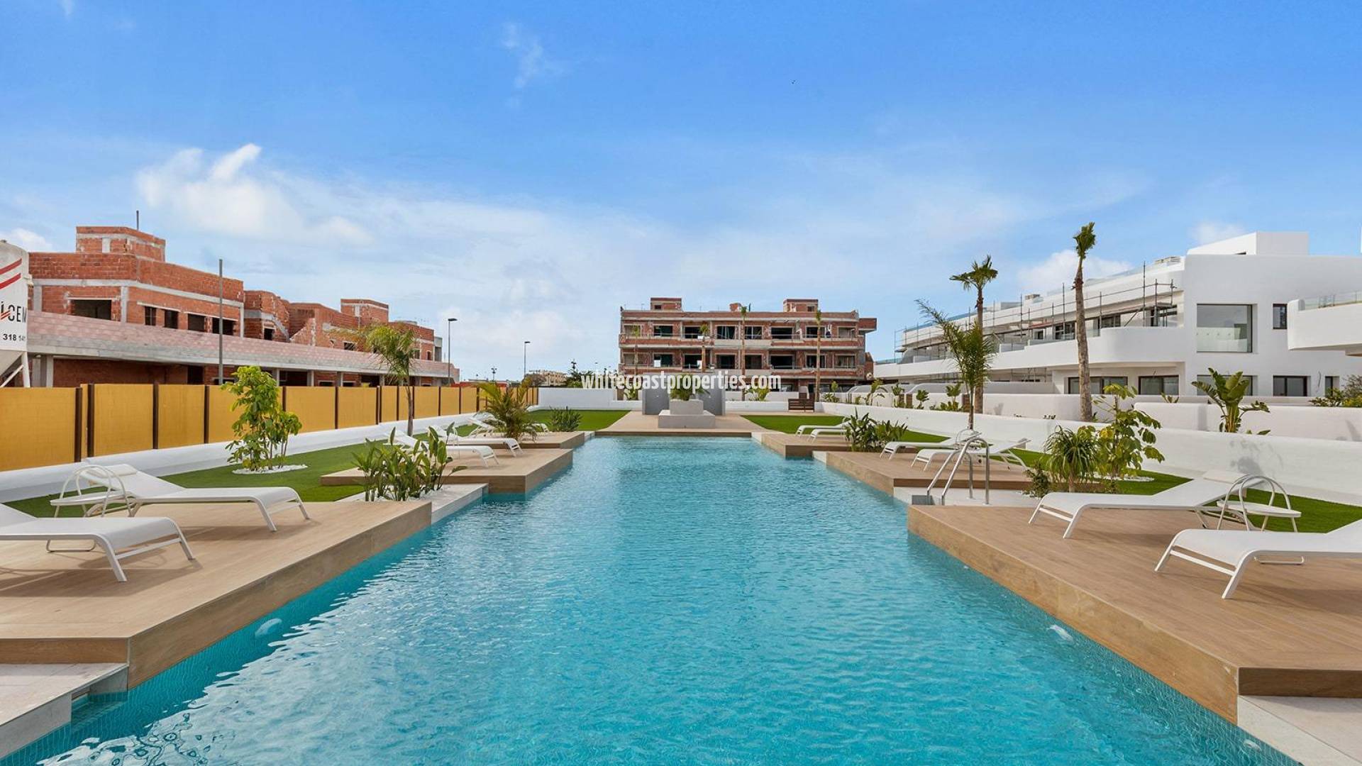 New Build Residential Complex Near Serena Golf and the Mar Menor in Los Alcazares Modern Coastal Living on the Costa Calida Discover this attractive new build residential complex located in Los Alcazares, one of the most popular seaside towns on the Costa Calida. Situated just 500 m from the beaches of the Mar Menor and within walking distance of the town center, this development offers an excellent combination of coastal living, golf surroundings and everyday convenience. Los Alcazares is well known for its relaxed atmosphere, long promenades, warm shallow waters and a wide range of restaurants, shops and services open all year round. Contemporary Apartments Designed for Comfort The development consists of 29 modern homes with 2 or 3 bedrooms, designed with clean architectural lines and high quality finishes. Buyers can choose between ground floor apartments with private garden and terrace, middle floor homes with spacious terraces, or penthouses with private terrace and rooftop solarium offering open views. Many of the properties enjoy views towards Serena Golf and the Mar Menor, creating a calm and pleasant living environment. All homes are designed to maximize natural light and functionality, making them ideal as a permanent residence, holiday home or investment property. High Quality Features and Communal Areas Each property includes a private parking space and a storage room. The specifications are designed to provide comfort and energy efficiency, including double glazed windows with thermal break, pre installation of ducted air conditioning, aerothermal system for domestic hot water, electric shutters in bedrooms and a complete interior and exterior lighting package. Bathrooms are delivered fully equipped with furniture, mirror and shower screen. Residents can enjoy attractive communal areas with landscaped gardens and a communal swimming pool, perfect for relaxing and enjoying the Mediterranean climate. Selected blocks are equipped with lifts for added convenience. Prime Location Between Golf and Sea This residential complex enjoys a privileged location next to Serena Golf, one of the most renowned golf courses in the area, and just a short walk from the calm waters of the Mar Menor. The area is ideal for swimming, sailing, paddleboarding and other water sports throughout the year. Key distances include Mar Menor beaches at 0.5 km, Serena Golf directly next to the development, Los Alcazares town center at 2 km, Cartagena at 22 km and Murcia city at 40 km. Murcia Corvera Airport is approximately 30 km away and Alicante Airport is around 90 km. An Ideal Home or Investment Opportunity With its excellent location, modern design and proximity to both golf and the sea, this new residential complex in Los Alcazares offers an outstanding lifestyle opportunity on the Costa Calida. Contact us today to receive more information or to arrange a private viewing and secure your new home by the Mar Menor.