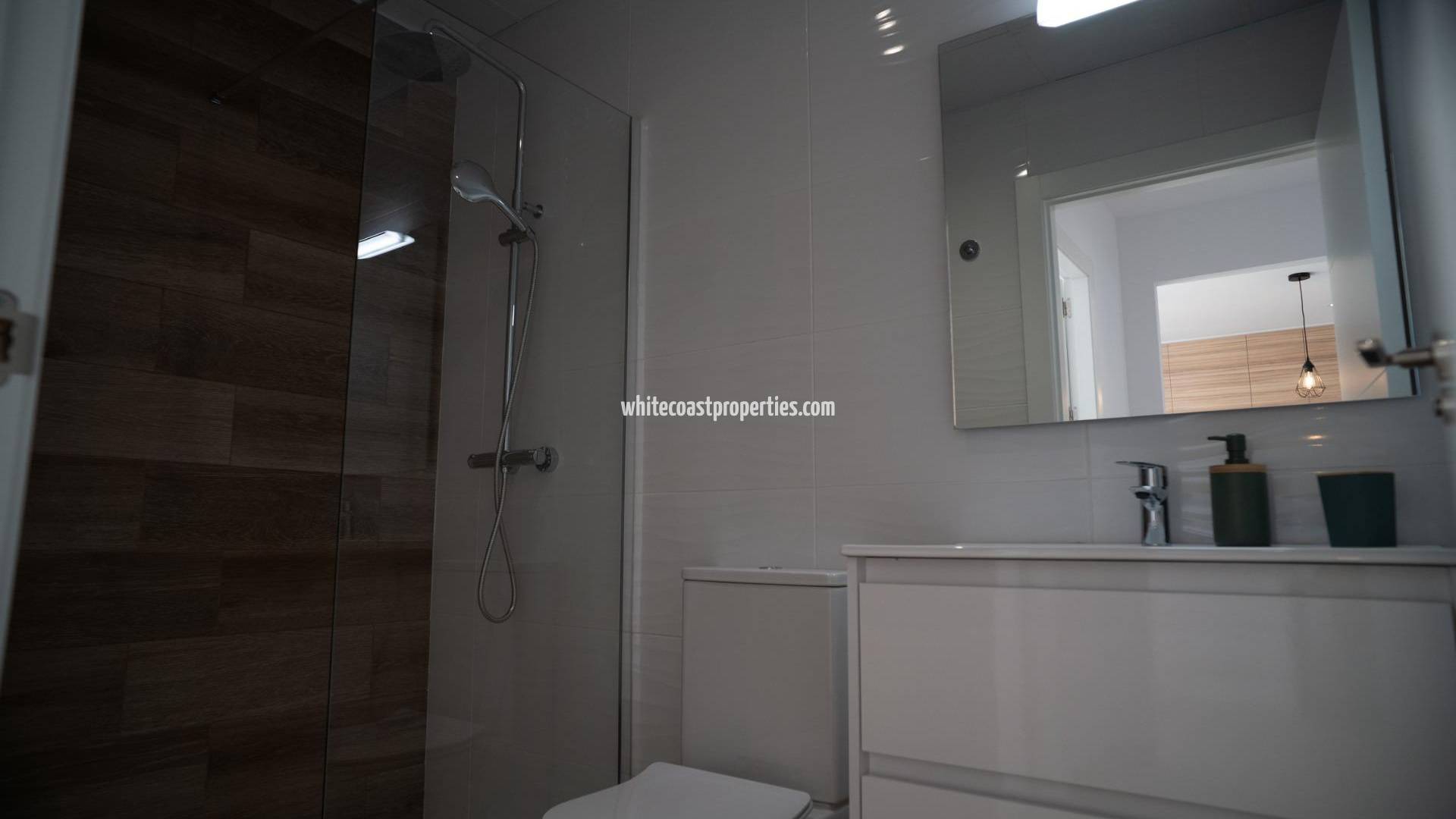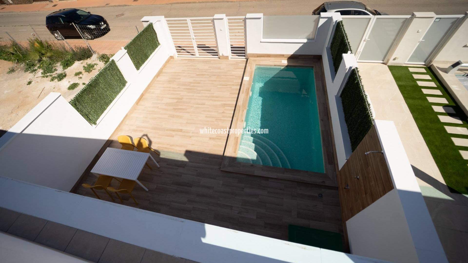 NEW BUILD TOWNHOUSES IN SAN JAVIER New Build luxury complex of 24 one level villas or on 2 floors with private pool, terraced area and solarium with Summer kitchen that allows you to enjoy all hours of sunshine, every day of the year. Each villa has 2 or 3 bedrooms and 2 fitted bathrooms on one level or 3 bedrooms and 3 fitted bathrooms on two levels. Designed with a contemporary style and open planned concept, comprising a fully-fitted kitchen and lounge-dining room. The development is located in San Javier (Murcia), near the beach, surrounded by services, parks, sports facilities and several Golf Courses. The property will meet the highest standards and will be equipped with: Private swimming pool with shower. Kitchen completely furnished and equipped with oven, microwave, fridge, integrated dishwasher, hob and extractor fan. Lighting: inside the property (dining room, kitchen, corridors and bathrooms) as well as in outdoor areas. Lined wardrobes with drawers. Fully fitted bathrooms with toilet, vanity unit, mirror and shower with screen panels. Pre-installation for ducted air conditioning. Solarium with Summer kitchen. Parking space on the plot. San Javier is close to all amenities with easy access to the beach, water sports, shops and the transport network. Here you can enjoy all of the facilities that San Javier has to offer such as the local shops, bars and restaurants as well as being near to shopping centres, the airport of Murcia and all of the beautiful places to be found along the Mar Menor. Corvera/Murcia airport is 30 minutes away and Alicante airport is 45 minutes away.