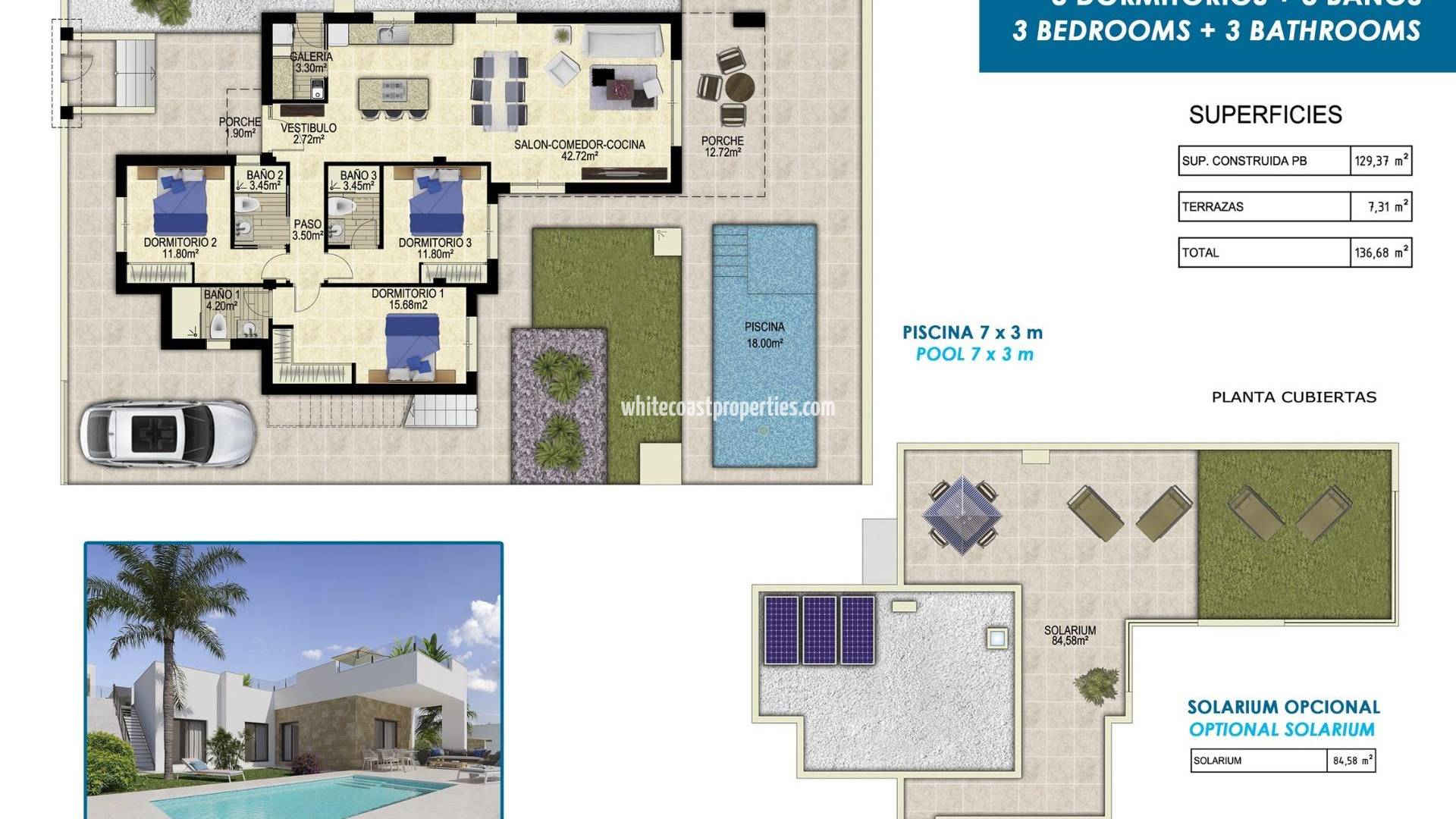 Потрясающие новые виллы в Полопе с видом на море Современные виллы с просторными участками и частными бассейнами Откройте для себя эти эксклюзивные новые виллы в Полопе, расположенные на больших участках площадью от 351 м². Эти дома предлагают идеальное сочетание современного дизайна, комфорта и захватывающих дух видов на море. Каждая вилла располагает частным бассейном 7x3 м с зоной для загара, большой террасой и крыльцом, а также частной парковкой, что делает их идеальным местом отдыха для тех, кто ищет спокойствия и роскоши. Две модели вилл в соответствии с вашим образом жизни Покупатели могут выбрать одну из двух различных моделей вилл, доступных в одноэтажном или двухэтажном варианте. Для тех, кто хочет максимально увеличить пространство на открытом воздухе, предлагается дополнительный частный солярий с панорамным видом на море - идеальное место, чтобы впитать средиземноморское солнце, которое светит в этом регионе большую часть года. Высококачественная отделка и энергоэффективность Эти виллы построены из высококачественных материалов и имеют современную отделку, обеспечивающую комфорт и энергоэффективность: Моторизованные жалюзи в гостиной, кухне и спальнях. Полы с подогревом во всех ванных комнатах. Предварительно установленные канальные кондиционеры для круглогодичного комфорта. Ландшафтный сад в средиземноморском стиле, не требующий особого ухода. Усиленная входная дверь с системой безопасности для дополнительного спокойствия. Аэротермальная система горячего водоснабжения. Три фотоэлектрические солнечные панели, что позволяет получить сертификат энергоэффективности класса А. Расположение в Полопе, недалеко от побережья Полоп - очаровательный средиземноморский городок в регионе Марина Баха, к северо-востоку от Аликанте. Известный своей богатой историей, яркой гастрономией и потрясающей природой, город предлагает спокойный образ жизни, оставаясь при этом недалеко от побережья. Ближайшие достопримечательности: От Полопа до Бенидорма - 15 минут на машине (знаменитые пляжи, магазины и ночная жизнь). От Полопа до Алтеи - 15 минут на машине (знаменит своим историческим старым городом и пристанью для яхт). От Полопа до города Аликанте - 30 минут. Международный аэропорт Аликанте - 40 минут. Ла Нусия - 5 минут (славится спортивными сооружениями мирового класса). Ближайший пляж - 8 км. Идеальное сочетание природы и удобства Благодаря удобному доступу к автомагистрали AP-7 жители поселка могут быстро добраться до всех крупных городов на побережье Коста-Бланка. В Полопе также проложены живописные пешеходные тропы, что делает его отличным выбором для любителей природы и активного отдыха. Приобретите дом своей мечты уже сегодня! Свяжитесь с нами, чтобы получить дополнительную информацию или запланировать визит.