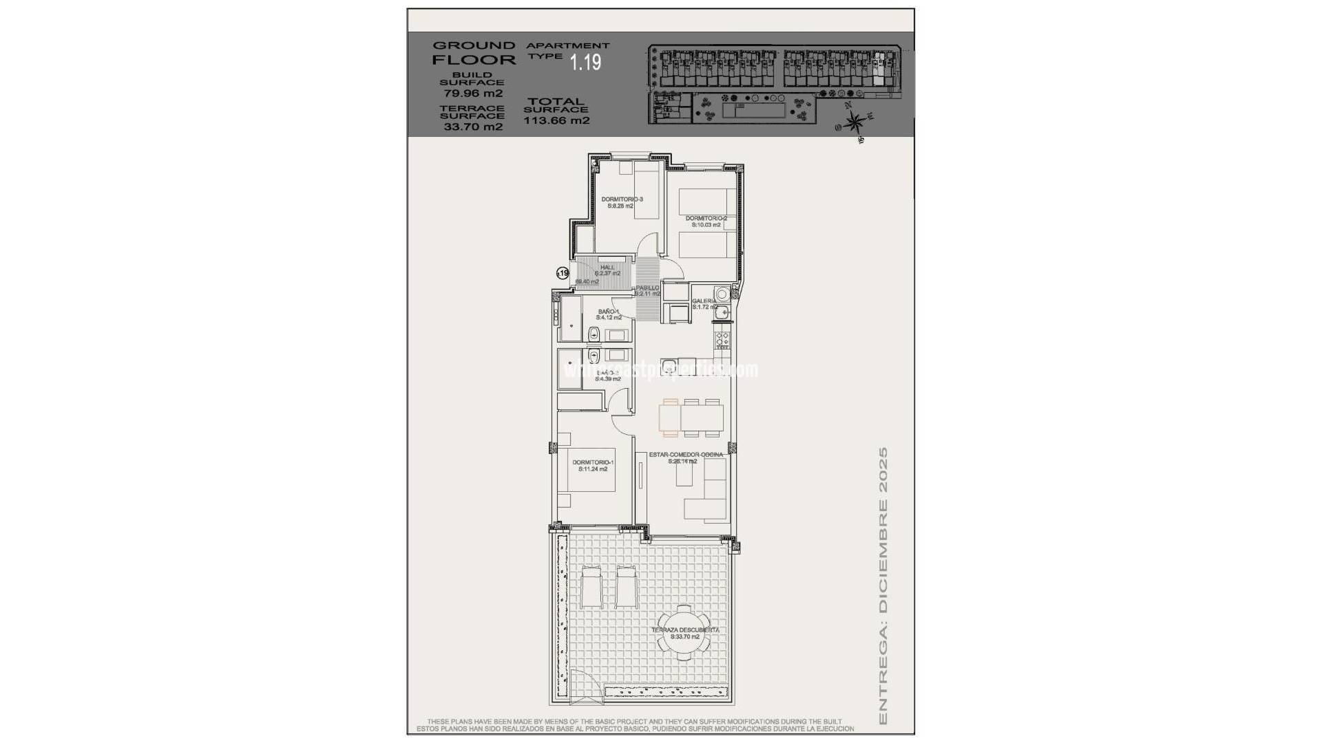 Новый жилой комплекс в Торревьехе, всего в 1 км от моря Современные апартаменты с 2 и 3 спальнями Расположенный в оживленном районе Альтос-дель-Соль в Торревьехе, этот новый жилой комплекс предлагает разнообразные варианты апартаментов с 2 и 3 спальнями. На первых этажах расположены частные сады, а на верхних этажах - частные солярии для эксклюзивного отдыха на свежем воздухе. Кроме того, в комплекс входит один таунхаус, предназначенный для тех, кто ищет дополнительное пространство и уединение. Каждая единица жилья включает в себя подземное парковочное место, а в качестве дополнительной опции предлагаются кладовые помещения. Просторные общественные зоны и удобства для всей семьи Жилой комплекс отличается продуманной планировкой и просторными коммунальными зонами, а также ландшафтными садами, создающими спокойную обстановку. Семьи могут наслаждаться большим общим бассейном с выделенной детской зоной, идеально подходящим для отдыха и общения под теплым средиземноморским солнцем. Комплекс расположен примерно в 1 км от пляжа Плайя-де-Лос-Локос, что обеспечивает удобный доступ к пляжу для жителей. Высококачественная отделка и энергоэффективные характеристики Эти дома отличаются высоким качеством отделки и вниманием к деталям. Каждый дом оснащен фотоэлектрической системой солнечных батарей мощностью 600 Вт, что обеспечивает экологически чистое энергоснабжение. Дополнительные функции премиум-класса включают встроенные барбекю в соляриях, бронированные входные двери, встроенные шкафы с внутренней отделкой, мебель для ванных комнат с душевыми экранами и полы с подогревом в ванных комнатах, обеспечивая комфорт и стиль в каждом уголке. Идеальное расположение вблизи услуг и достопримечательностей Этот комплекс расположен вблизи всех основных услуг, что делает его удобным местом как для постоянных жителей, так и для тех, кто ищет дом для отдыха. Альтос-дель-Соль известен своим хорошо развитым районом с местными магазинами, ресторанами и развлекательными заведениями в нескольких минутах ходьбы. Аэропорт Аликанте-Эльче находится в 45 минутах езды (43 км), а торговый центр Habaneras - всего в 3 км. Насладитесь средиземноморским стилем жизни Торревьехи Торревьеха, расположенная на юге Аликанте, предлагает квинтэссенцию средиземноморского образа жизни. Здесь более 300 солнечных дней в году, а среднегодовая температура составляет 20ºC, поэтому жители могут наслаждаться прекрасной погодой круглый год. Город славится своей богатой гастрономией, в которой присутствуют свежие ингредиенты как с моря, так и с местных ферм. Кроме того, в Торревьехе есть живописные пляжи, набережные, музеи и множество развлечений, подходящих для семей с детьми, что обеспечивает образ жизни, наполненный отдыхом и расслаблением. Приезжайте исследовать Торревьеху Независимо от того, ищете ли вы оживленное приморское сообщество или спокойное уединение, этот комплекс предлагает уникальную возможность насладиться лучшим прибрежным очарованием Торревьехи. Оцените все, что может предложить этот прекрасный город - от теплого климата до богатого культурного и кулинарного наследия.