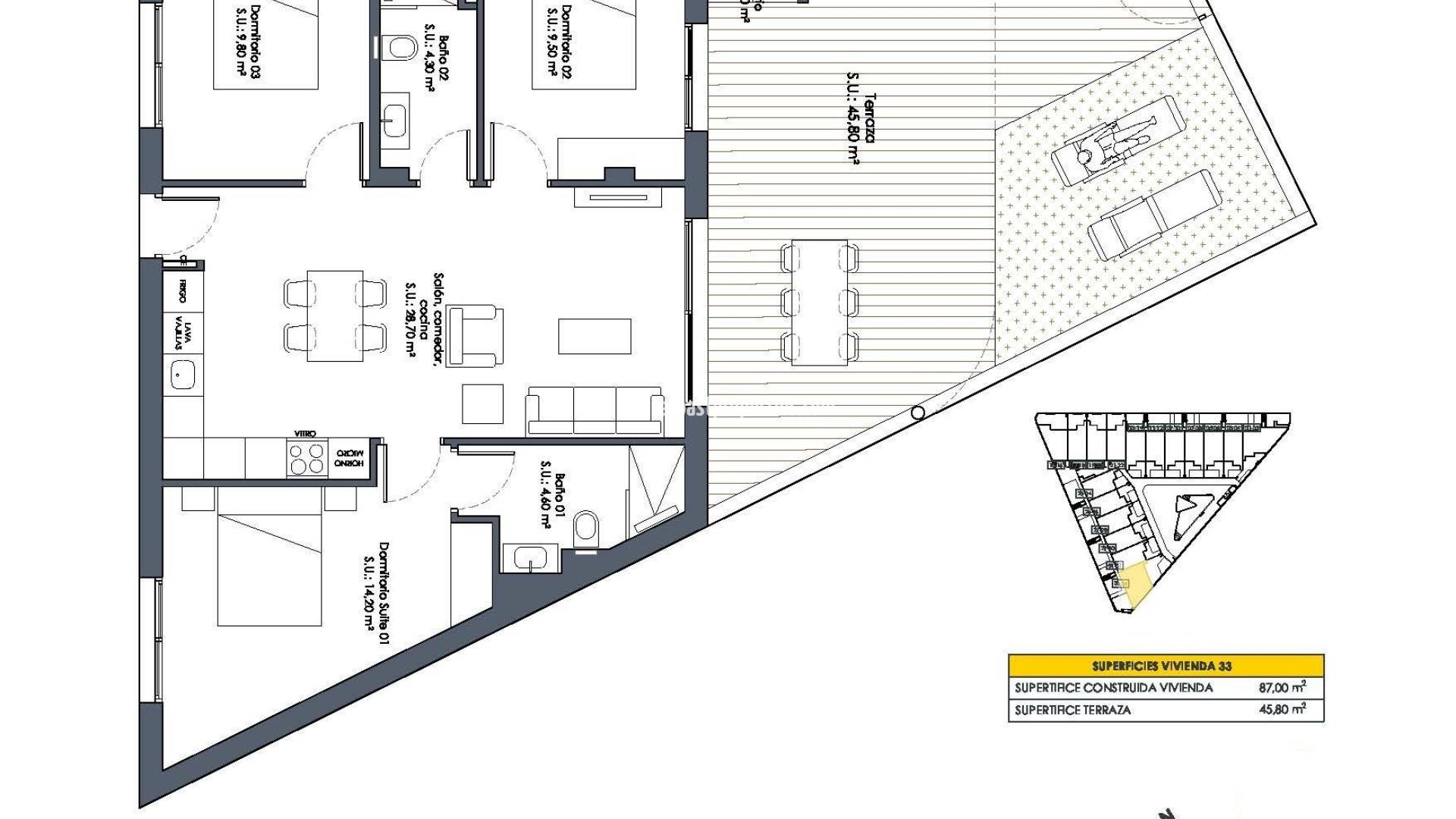 Новый жилой комплекс в Сан-Фульхенсио Современные квартиры с исключительными характеристиками Откройте для себя этот новый жилой комплекс в Сан-Фульхенсио, предлагающий 2 и 3-спальные квартиры, спроектированные для комфорта, стиля и удобства. Особенности комплекса: Квартиры на первом этаже с частными садами Пентхаусы с частными соляриями, беседками, электрическими розетками и точками водоснабжения. Каждая квартира включает в себя частное парковочное место, а комплекс может похвастаться общим бассейном в средиземноморском стиле с водной гладью площадью 85 м², окруженным прекрасными ландшафтными садами. Высококачественная отделка и современный дизайн Эти дома построены из высококачественных материалов и оснащены современными элементами, обеспечивающими энергоэффективность и высокий уровень жизни: Электрические жалюзи в спальнях Наружные столярные изделия с двойным остеклением и технологией терморазрыва Полностью оборудованные ванные комнаты с туалетными столиками, зеркалами и душевыми экранами Светодиодное освещение по всему дому Предварительно установленный канальный кондиционер для климат-контроля Удачное расположение рядом с пляжами, гольфом и достопримечательностями Сан-Фульхенсио - очаровательный испанский городок с ресторанами, магазинами и основными услугами в нескольких минутах ходьбы. Его стратегическое расположение обеспечивает быстрый доступ к некоторым из лучших достопримечательностей на побережье Коста-Бланка: Международный аэропорт Аликанте-Эльче - 30 км (30 минут) Пляж Ла Марина - 7 км (10 минут) Гуардамар-дель-Сегура - 10 км (12 мин) Поле для гольфа La Marquesa (Сьюдад Кесада) - 6 км (8 мин) Центр города Торревьеха - 18 км (20 мин) Торговые центры, рестораны и места отдыха - в нескольких минутах езды Идеальный дом для жизни на побережье Этот новый комплекс в Сан-Фульхенсио идеально подходит для тех, кто ищет современный дом для отдыха, инвестиционную недвижимость или постоянное место жительства на побережье Коста-Бланка. Благодаря своему отличному расположению рядом с пляжем, полями для гольфа и основными услугами, он предлагает спокойный, но в то же время хорошо связанный образ жизни. Не упустите возможность стать владельцем совершенно нового дома в Сан-Фульхенсио. Свяжитесь с нами сегодня, чтобы узнать подробности или запланировать визит!