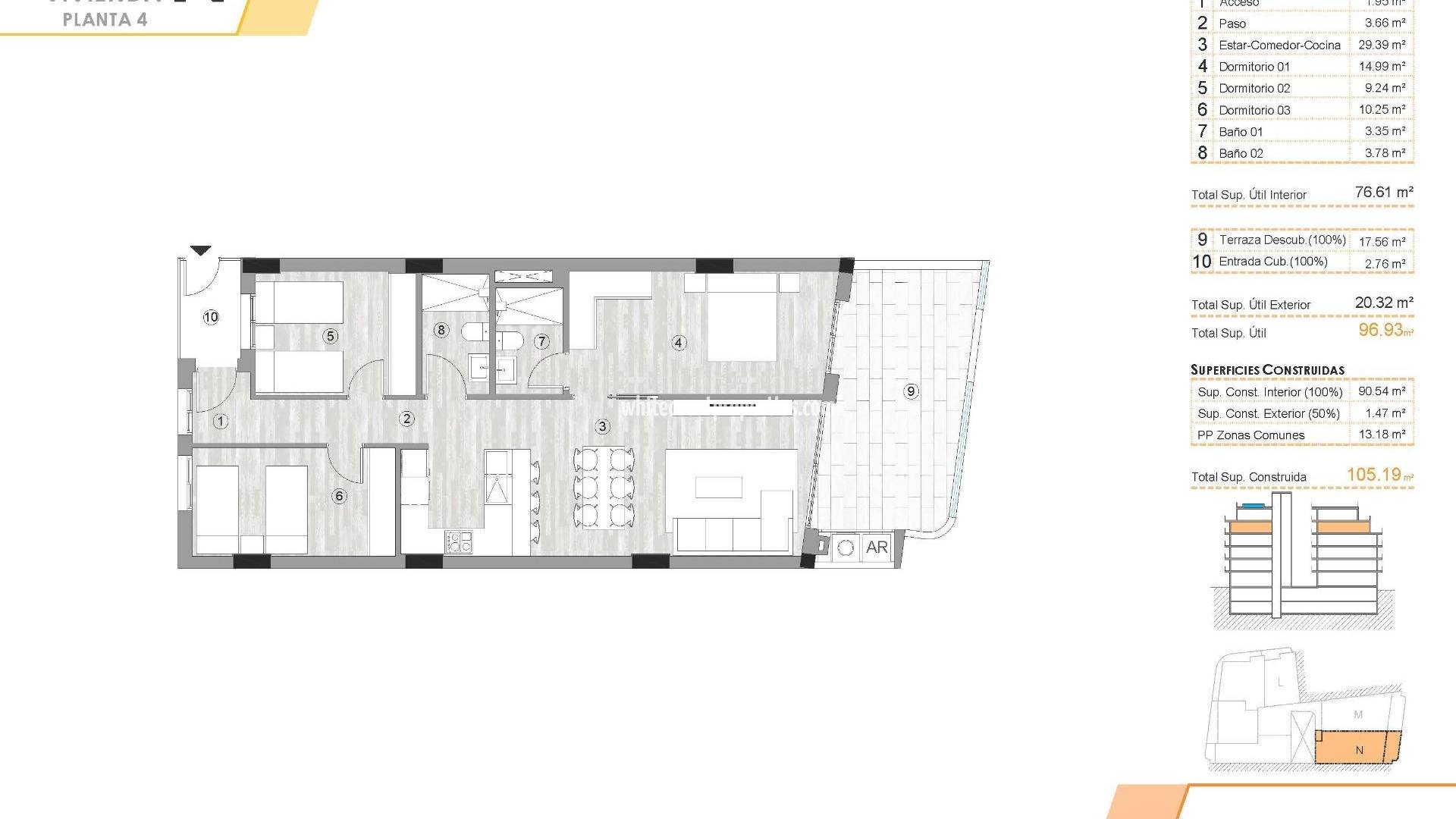 Новые апартаменты в центре Торревьехи Всего в 400 м от пляжа Плайя-дель-Кура Выгодное расположение в центре Торревьехи Этот новый жилой комплекс имеет выгодное расположение в центре Торревьехи, всего в 400 м от пляжа Плайя-дель-Кура. В окружении магазинов, супермаркетов, ресторанов и повседневных услуг, он предлагает все необходимое в шаговой доступности. В этом районе также есть парки, зоны отдыха и зеленые насаждения, что создает идеальный баланс между городским удобством и возможностью для отдыха. Современные дома с 2 и 3 спальнями Комплекс предлагает на выбор апартаменты с 2 и 3 спальнями, в том числе пентхаусы, некоторые из которых имеют частные солярии. Каждая квартира спроектирована в современном стиле, с открытой планировкой, большими террасами и встроенными кухнями американского типа. Ванные комнаты полностью оборудованы мебелью, душевыми перегородками и полами с подогревом. Кухни оснащены бытовой техникой, а в каждой квартире предусмотрена предварительная установка для канального кондиционирования. Дополнительно можно приобрести подземное парковочное место и кладовые комнаты. Удобства курортного типа для хорошего самочувствия Жители могут пользоваться рядом эксклюзивных удобств. На первом этаже находится полностью оборудованный тренажерный зал, идеально подходящий для ежедневных тренировок. Солярий на крыше — настоящий оазис релаксации с шезлонгами, финской сауной и мини-бассейном. Лифт и лестница ведут прямо на крышу, что обеспечивает максимальное удобство и доступность. Жизнь в уникальной природной и прибрежной среде Торревьеха известна своим теплым средиземноморским климатом со средней годовой температурой 20ºC, что делает ее идеальным местом для проживания круглый год. Город славится своими природными соляными лагунами и охраняемым природным парком Ла-Мата и Торревьеха, расположенным всего в 4 км от комплекса. Его розовые и зеленые озера, живописные пешеходные маршруты и богатое биоразнообразие предлагают здоровый и вдохновляющий образ жизни. Расстояния до основных достопримечательностей Пляж Плайя-дель-Кура 0,4 км Пристань для яхт Торревьеха 1 км Природный парк Ла-Мата 4 км Гольф-клуб Вильямартин 8 км Аэропорт Аликанте 45 км Аэропорт Мурсия 60 км Оцените средиземноморский образ жизни Не упустите возможность приобрести современный дом в одном из самых привлекательных прибрежных городов Коста-Бланки. Свяжитесь с нами сегодня, чтобы договориться о посещении и обеспечить себе место в этом исключительном новом комплексе.